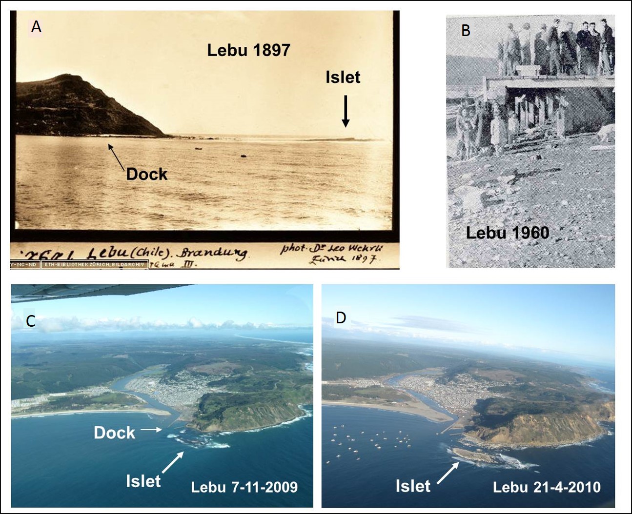 Fig. 5. Lebu at different years. A. 1897 picture showing the active cliff and small islet. B. 1960 coseismic uplift resulted in the dry dock (from Veyl, 1960). C. November 7th 2009 picture showing an active cliff and small islet. D. 2010 after Maule earthquake picture showing evidences of an emersion like big islet, inactive cliff and almost dry Lebu river mouth. Note the ships outside Lebu river mouth that cannot penetrate the river.