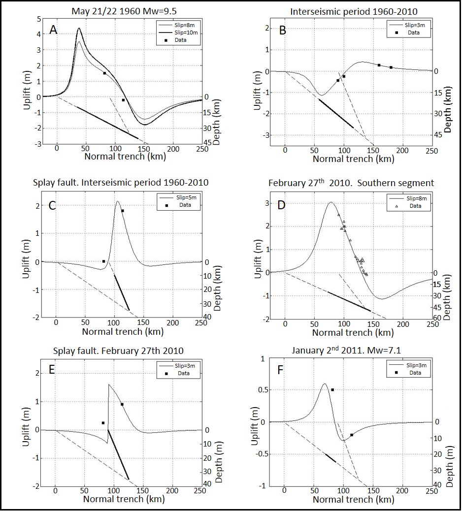 During the Maule 2010 earthquake, theoretically expected coseismic vertical ground movements with decreasing vertical uplift from trench to the Andes Cordillera occurred in most of the rupture zone with the exception of Tirúa-Mocha Island area (Fig. 2). As shown in model D (Fig. 10D), the slip that occurred in Arauco Peninsula and northward including Santa María Island, can be explained by 8±0.3 m slip only in the Wadati-Benioff plane. In contrast, as shown in Model E (Fig. 10E), the smaller uplift in Mocha Island than Tirúa, can be explained by activity only in the splay fault with 3±0.4336 m slip that reached the sea bottom. This is similar to the situation that occurred during the 1964 Alaska earthquake were some splay faults were active such as the Hanning bay and Patton Bay splay faults that were visible in Montage Island (Plafker, 1972) generating additional vertical uplift, and the Suckling Hills splay fault that explains the abnormal high coseismic movement in the border of Alaskan and Aleutian subduction zones (Chapman et al., 2014) or several splay faults activated during the New Zealand 2016 Kaikoura Earthquake (Hollingsworth et al., 2017; Wang et al., 2018). Finally, the vertical ground movements at Tirúa-Mocha Island area during the Araucanía 2011 earthquake display a normal trend, with bigger uplift at Mocha Island and subsidence at Tirúa. From model F (Fig. 10F), that coseismic uplift trend, can be explained by activity only in the Wadati-Benioff plane at 20-25 km with 3 m slip.