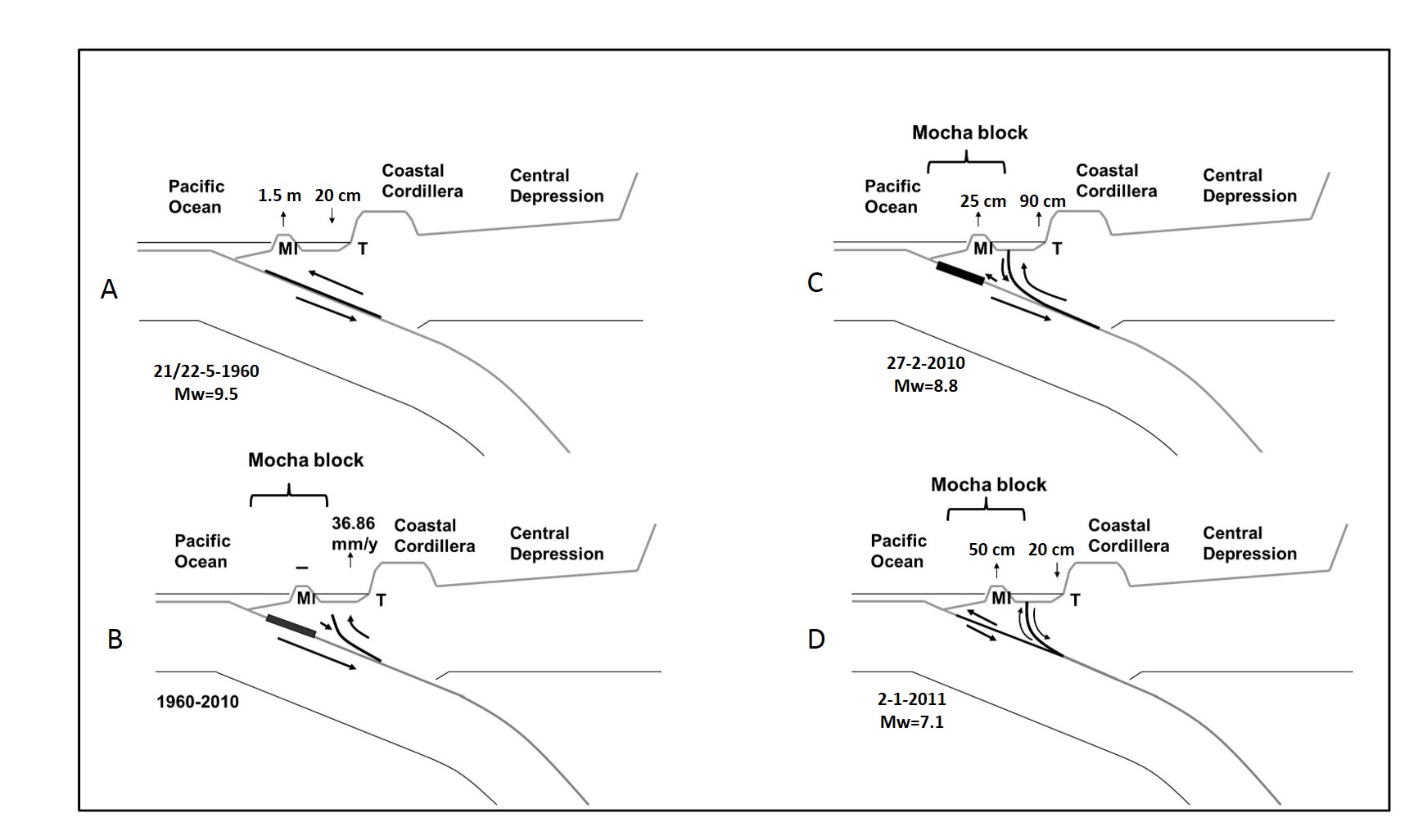 We speculate that a strong asperity was developed after the Valdivia 1960 earthquake at the updip of Wadati-Benioff plane at Tirúa-Mocha area, generating strong coupling and the activity of the Tirúa-Mocha splay fault. During 2010 Maule earthquake, such asperity remained arresting the trenchward coseismic movement of South American plate, generating local compression accommodated by the Tirúa-Mocha splay fault and Mocha block remained coupled (Fig. 11C). So high stress continued in this zone until the Araucanía 2011 earthquake in which the asperity was finally overcome and the Tirúa Mocha splay fault had tectonic inversion with normal movement and Mocha block moved trenchward (Fig. 11D). Finally the seismic activity of moderate magnitude in the Tirúa-Mocha zone ended after Araucanía 2011 earthquake indicating that the main amount of stress accumulation at Tirúa-Mocha area was released.