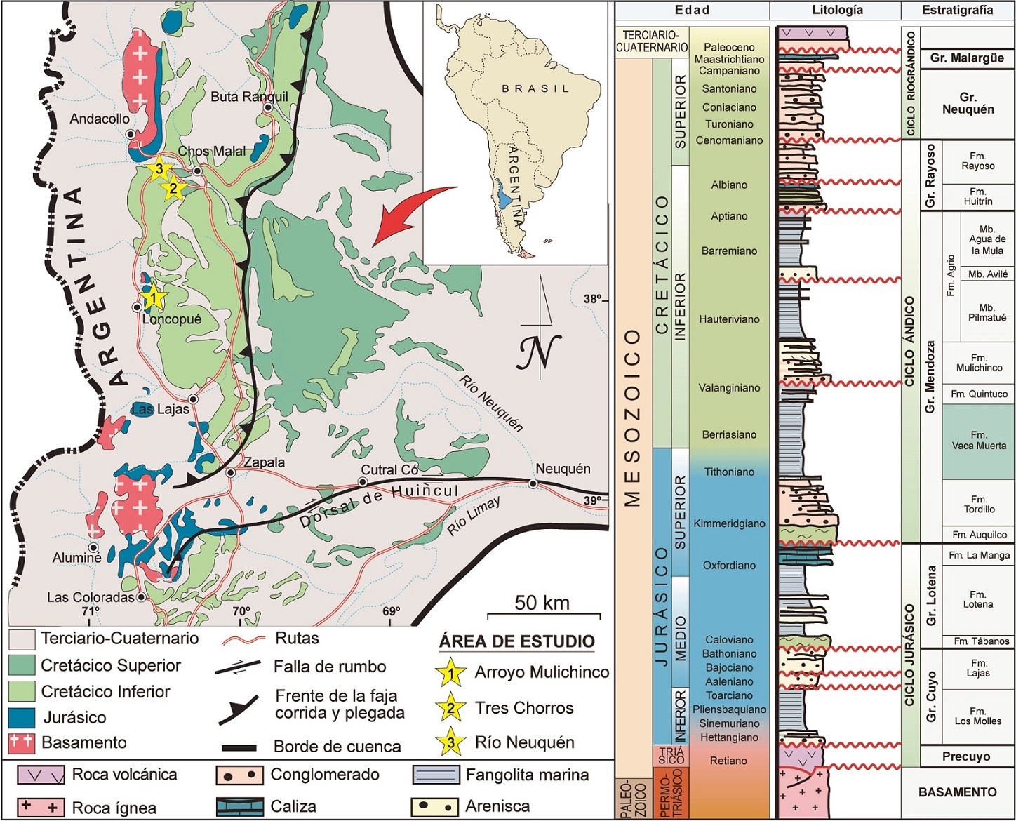 FIG. 1. Mapa geológico y columna estratigráfica esquemática de la región central de la Cuenca Neuquina (Modificado de Zavala et al., 2006).