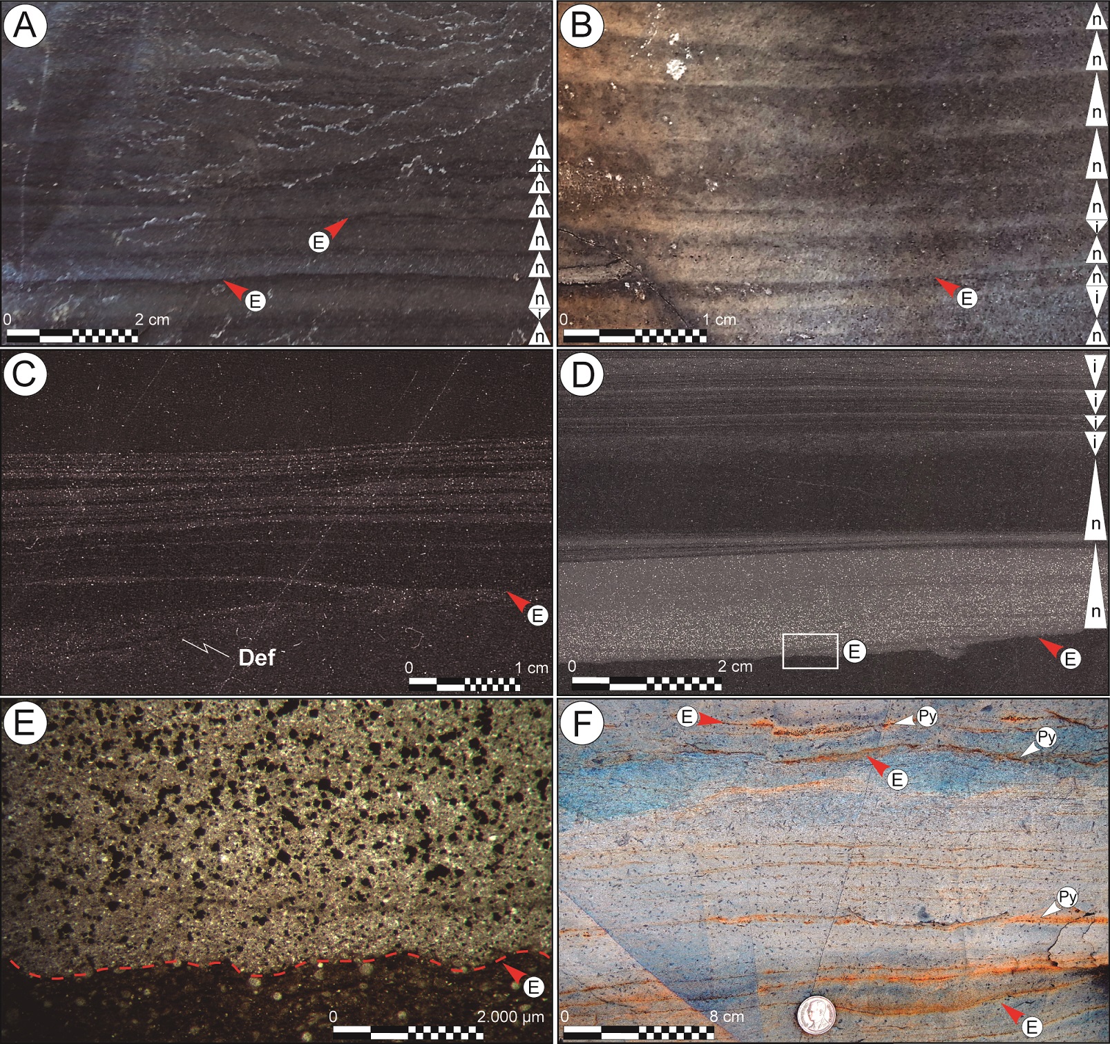Como puede observarse en la figura 5A y B, estos depósitos suelen presentarse en sucesivas capas gradadas de espesor variable (<1-5 cm), las que comúnmente se encuentran delimitadas por contactos erosivos (Fig. 5C, D y E). En algunos casos, los límites de capas están definidos por un nivel anaranjado de pirita oxidada que se reconoce muy bien en la superficie externa de las concre-ciones (Fig. 5F). Las capas pueden tener gradación normal o eventualmente gradación inversa (Fig. 5A y B). Las variaciones granulométricas preliminares surgidas a partir de la observación directa de los cortes macroscópicos pulidos fueron posteriormente ajustadas mediante estudios de secciones delgadas. La perfecta preservación de la fábrica primaria en estos depósitos se asocia a la ausencia de bioturbación sumada a una cementación temprana que produjo un “congelamiento” de la fábrica depositacional.