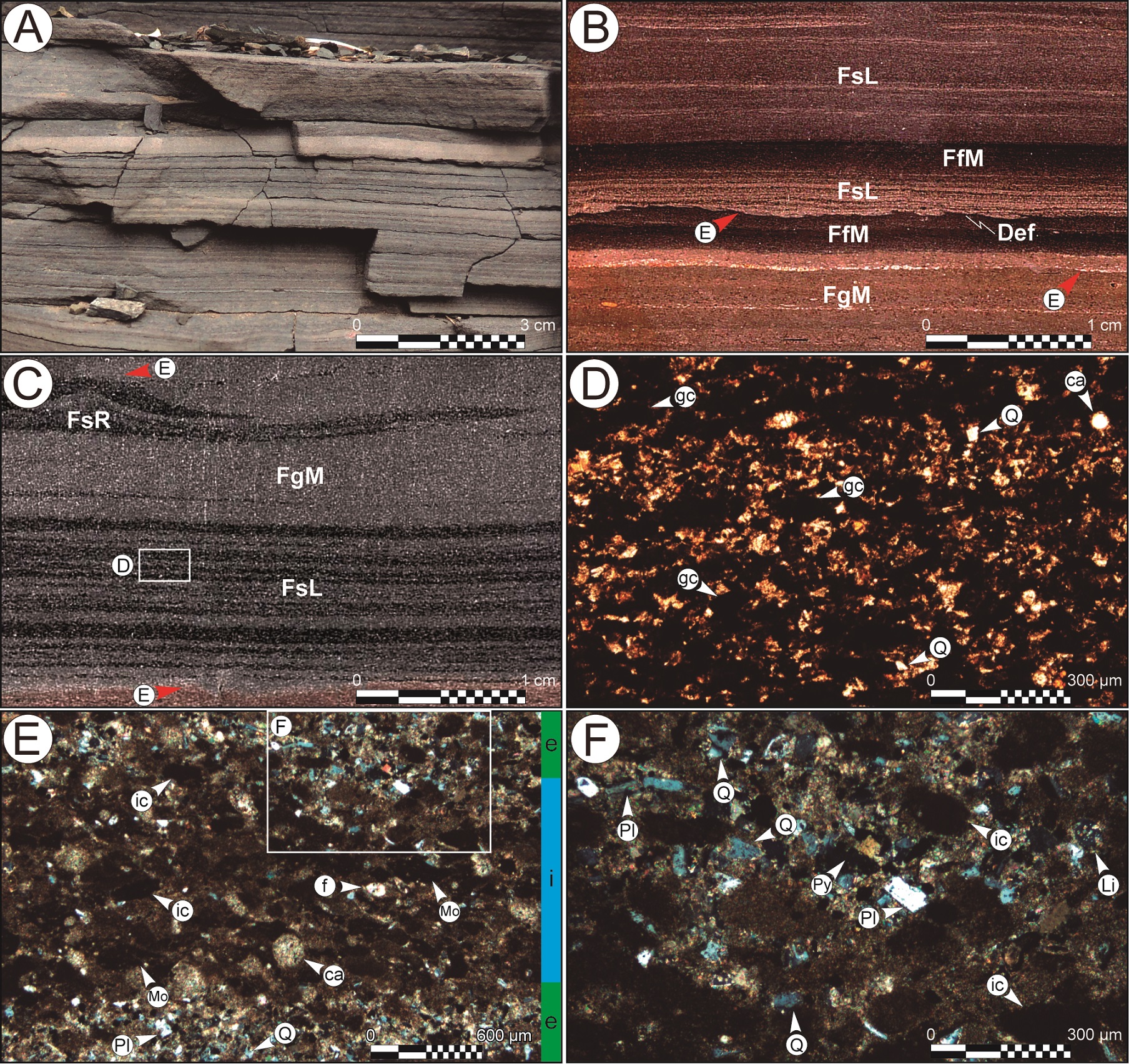 Esta facies se compone de fangolitas arenosas a gruesas finamente laminadas (Fig. 8A). Por lo general, la facies FsL se presenta en forma neta/erosiva (Fig. 8B y C), y está definida por una laminación fina caracterizada por láminas planares continuas dispuestas en forma paralela (Fig. 8C). Composicionalmente, dicha facies es semejante a la facies FsR (Fig. 7), caracterizada por una alternancia milimétrica de láminas de fangolitas medias a gruesas compuestas por fango detrítico extracuencal (Fig. 8E), y por láminas oscuras de fangolitas arenosas compuestas en su mayoría por intraclastos y calciesferas de origen intracuencal (Fig. 8D, E y F).