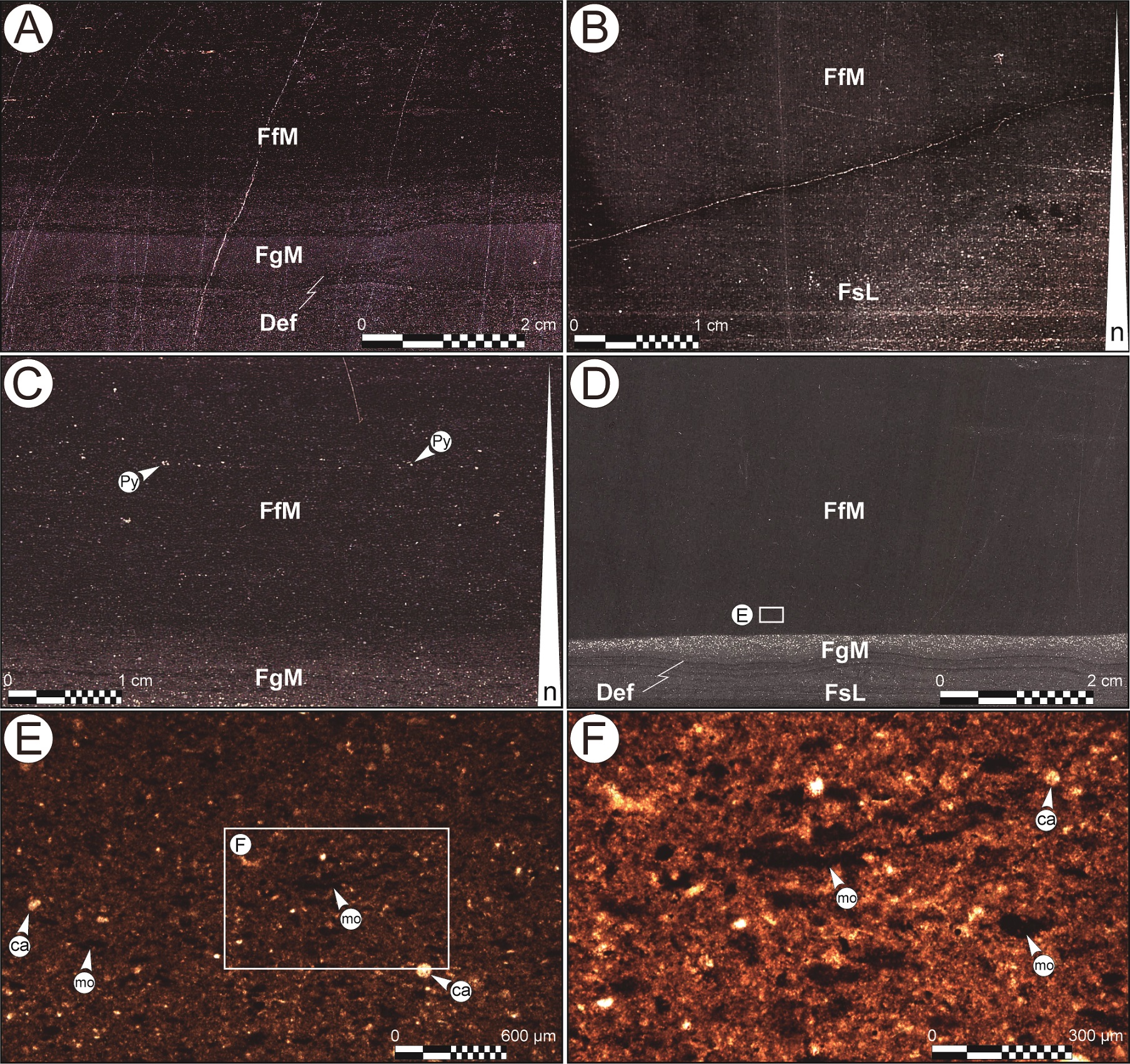 Las estructuras deformacionales no se reconocen con facilidad, sino que su identificación solo es factible en cortes macroscópicos pulidos. La facies FgM está compuesta por fango grueso (>32 μm) detrítico de color grisáceo, representado por clastos de cuarzo y plagioclasa, con algunos líticos subordinados (Fig. 6E y F). Además, se caracteriza por presentar un arreglo macizo, aunque en algunos casos puede tener lamina-ción planar difusa, discontinua, paralela (Fig. 6D).