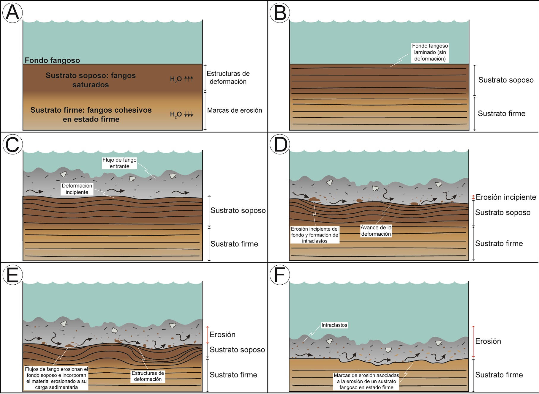 Al igual que en la facies FgM, la presencia de un contacto basal erosivo mostraría que inicialmente estos flujos de fango habrían sido capaces de erosionar el fondo fangoso, incorporando el material intracuencal erosionado a su carga sedimentaria, y eventualmente transportarlo por tracción (Fig. 7G). Ensayos de laboratorio en canales artificiales han comprobado que, a una profundidad de 5 cm, un flujo de fango con una velocidad de 15-30 cm/s puede transportar arcillas floculadas (y/o intraclastos arcillosos, fango calcáreo) como carga tractiva, y así dar lugar a la formación y migración de ondulas de fango (Schieber et al., 2007; Schieber y Southard, 2009; Schieber y Yawar, 2009; Schieber et al.,2013).