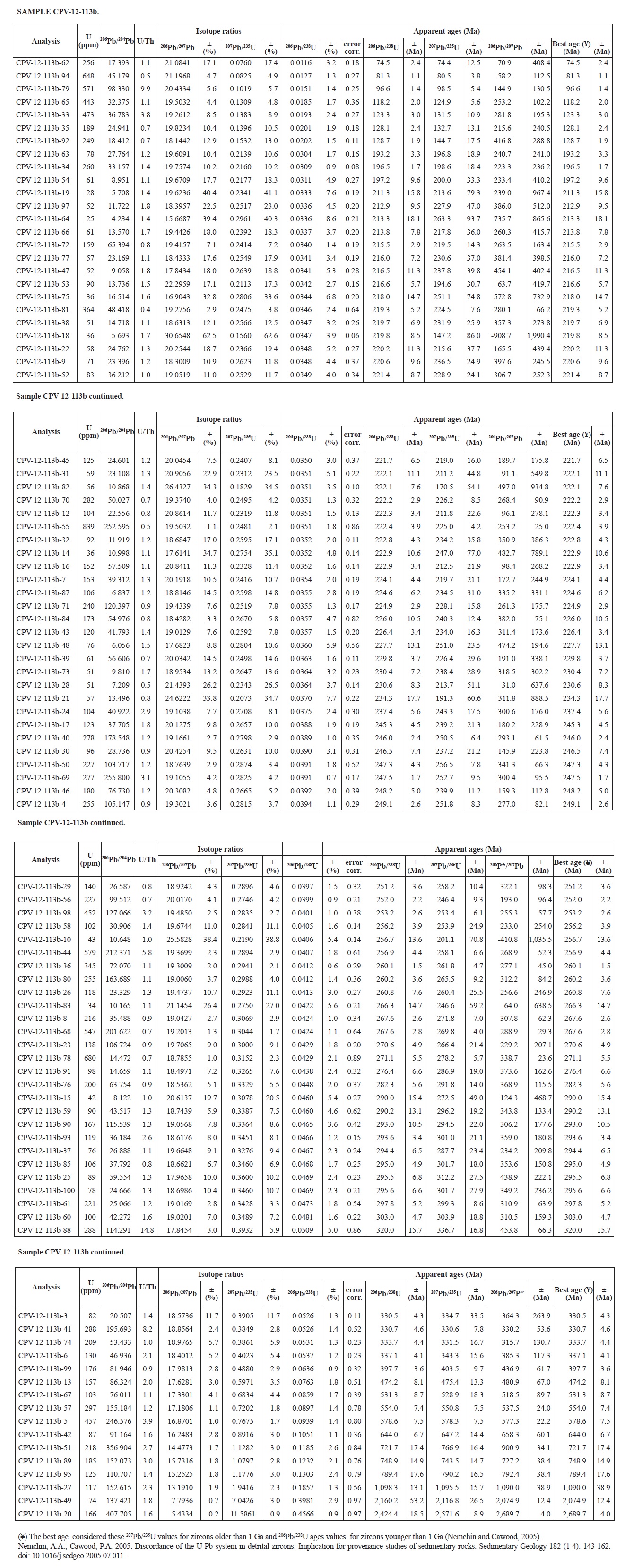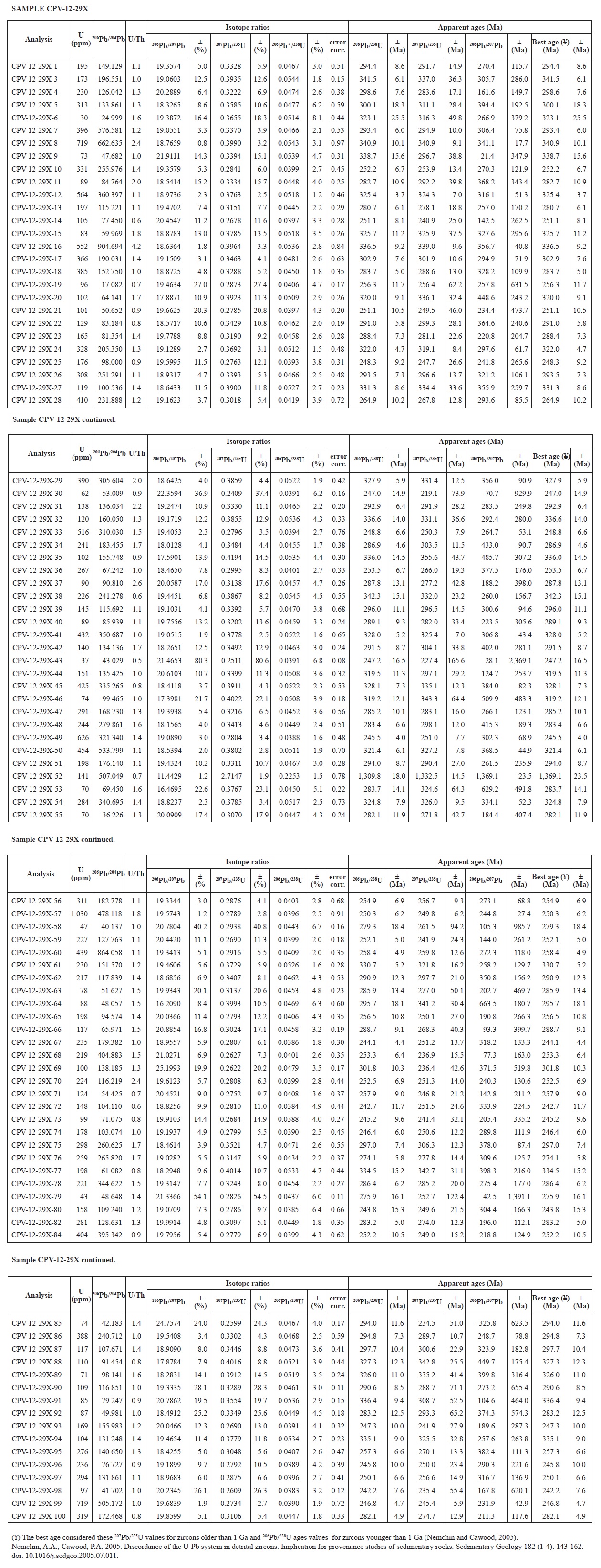A sandstone from the bottom of the type locality section (CPV-12-88X) yielded five unmixed Permian-Carboniferous age peaks (n=94): 264.5±5.3, 280.2±5.3, 290.4±4.4, 303.2±3.2 and 331.3±12 Ma (Fig. 7), and four dispersed zircons between 450 and 500 Ma.