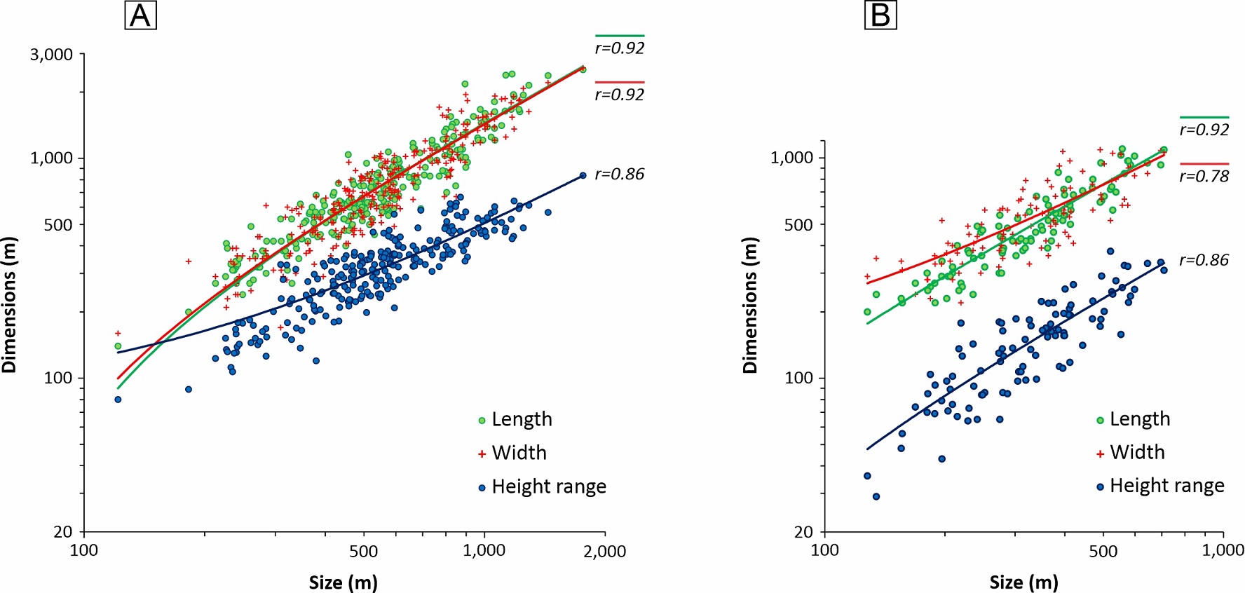 As cirques expand, L and W exhibit a higher rise than H (Fig. 6A); nevertheless, vertical growth is more concomitant with L than with W. This allometric-type development is also confirmed by the greater degree of correlation of L and A with Size and A parameters, compared to the one presented by H in relation to them: L-Size (r=0.92) and L-A (r=0.91); W-Size (r=0.92) and W-A (r=0.87); H-Size (r=0.86) and H-A (r=0.67) (Table 3). More vertically developed cirques are located with a slight predominance towards the W, in Martial Mountains and Vinciguerra Range, where altitudes and gradients are higher (Fig. 7A).