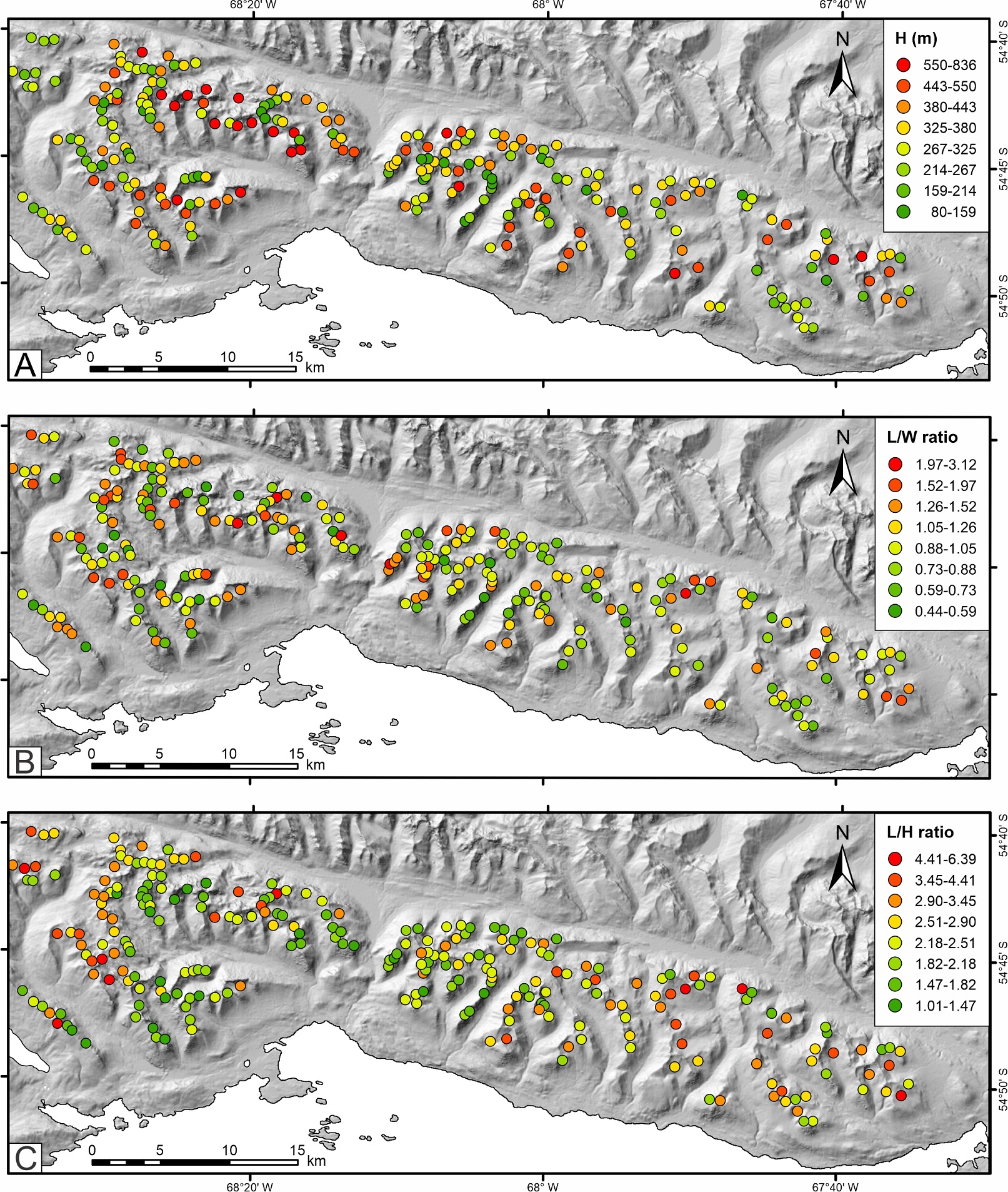 Fig. 7. Spatial distribution of first-order cirques according to A. Height range (H). B. Lengthwise elongation (L/W index). C. Incision (L/H index).