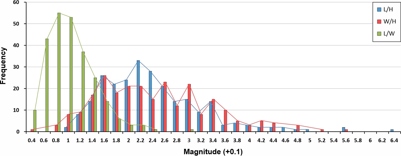 Fig. 8. First-order cirques frequency distribution of L/H, W/H and L/W shape indexes.