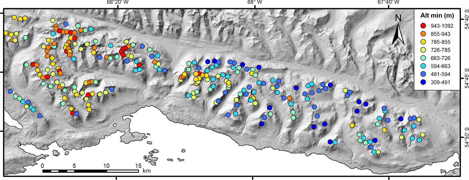 Fig. 9. Geographical distribution of first-order cirques’ minimum floor altitude (Altmin).