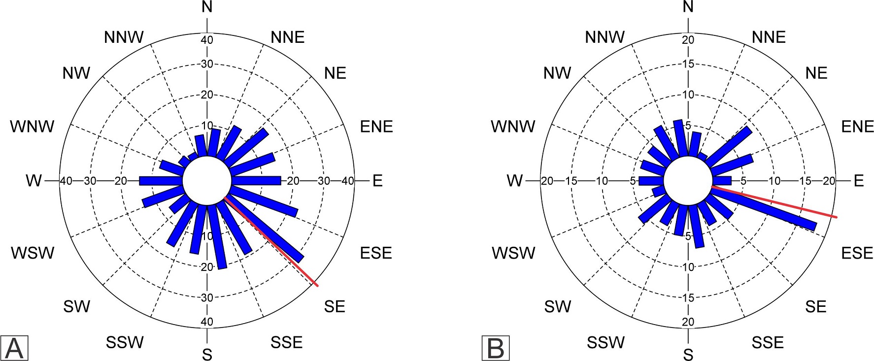Fig. 10. Distribution of (A) first-order and (B) inner cirques according to their median axis aspect. The red radial line denotes the mean azimuth of cirque population.