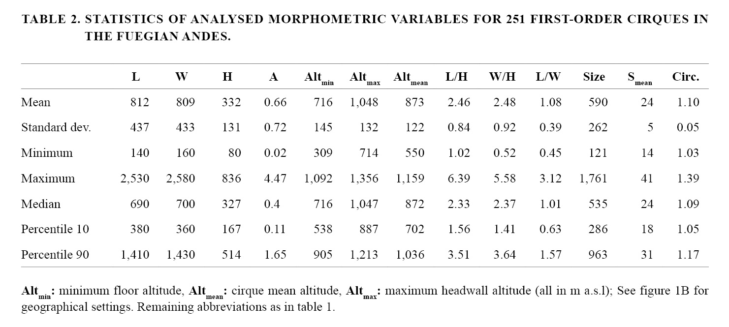 Keywords: Glacial cirques, Allometry, Cirque distribution, Fuegian Andes, Tierra del Fuego.