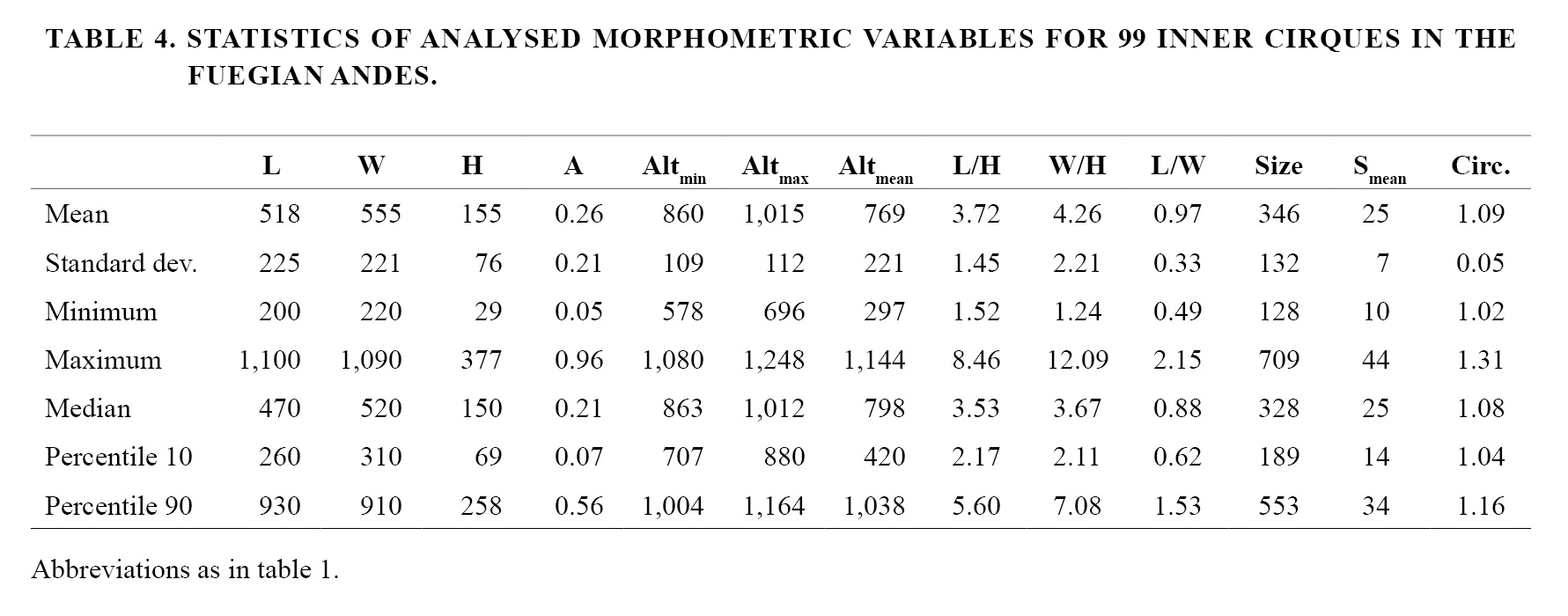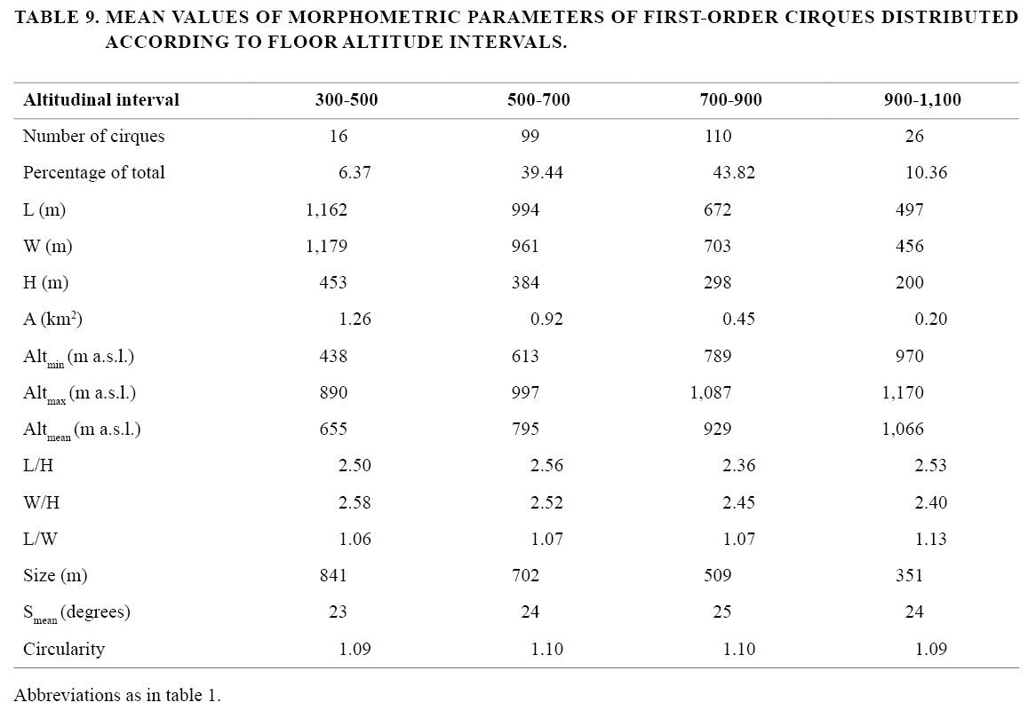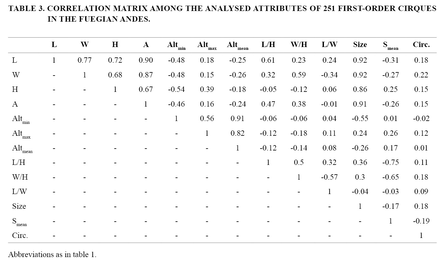 The total cirque set covers the 19.5% of the planar surface encompassed by the mountainous segment considered (intermountain valleys excluded). For 80% of first-order cirques, length (L) ranges from 380 m to 1,410 m (mean L=812 m), width (W) ranges from 360 m to 1,430 m (809 m) height range (H) varies between 167 m to 514 m (332 m) and area (A) falls in the interval between 0.11 km2 and 1.65 km2 (0.66 km2) (Table 2). Two cirques with significantly higher dimensions than the average were identified, with mean A of 6.71 km2, mean L of 2,300 m, mean W of 3,700 m and mean H of 712 m. These cirques were not considered in the statistical analysis of data because of their unrepresentativeness, therefore all tables and correlations are based on the remaining 251 first-order cirques to which is alluded to in this work. Cirques exhibiting larger planar dimensions are concentrated on the eastern portion of the studied range (E half of Sorondo Range), although the two more areally developed cirques in the set are located towards the W, in the Vinciguerra Range. This range and the Martial Mountains contain the majority of cirques with lower areal extent.