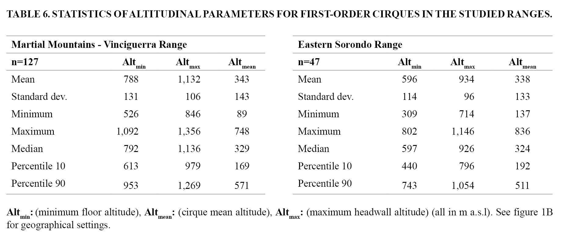 On the other hand, inner cirque floor altitudes in the analysed ranges are distributed in conformity with aspect: the lowest face SE, E and S sectors, which in turn are the dominant aspects, whereas the highest are N-facing and W-facing (Table 8). This trend supports the assumption that inner cirques were eroded by small ice masses strongly governed by an ELA near peaks (see Section 6.2.), which should have accentuated glacial asymmetry despite high topographic elevation, and is also in accordance with the context of generalized aridity and relatively cloudless skies proposed for the region during past glacial episodes.