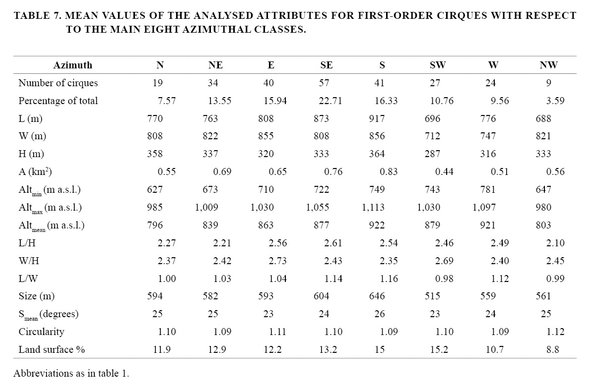Finally, eastern preference noticed in cirque aspect in the analysed sector could also be accentuated by prevalence of slopes exposed to the S, SE and E (40.4% of the total area; 55% of cirque population) over those facing N, NW and W, the most climatically adverse aspects (31.4%; 20.72%) (Table 7).
