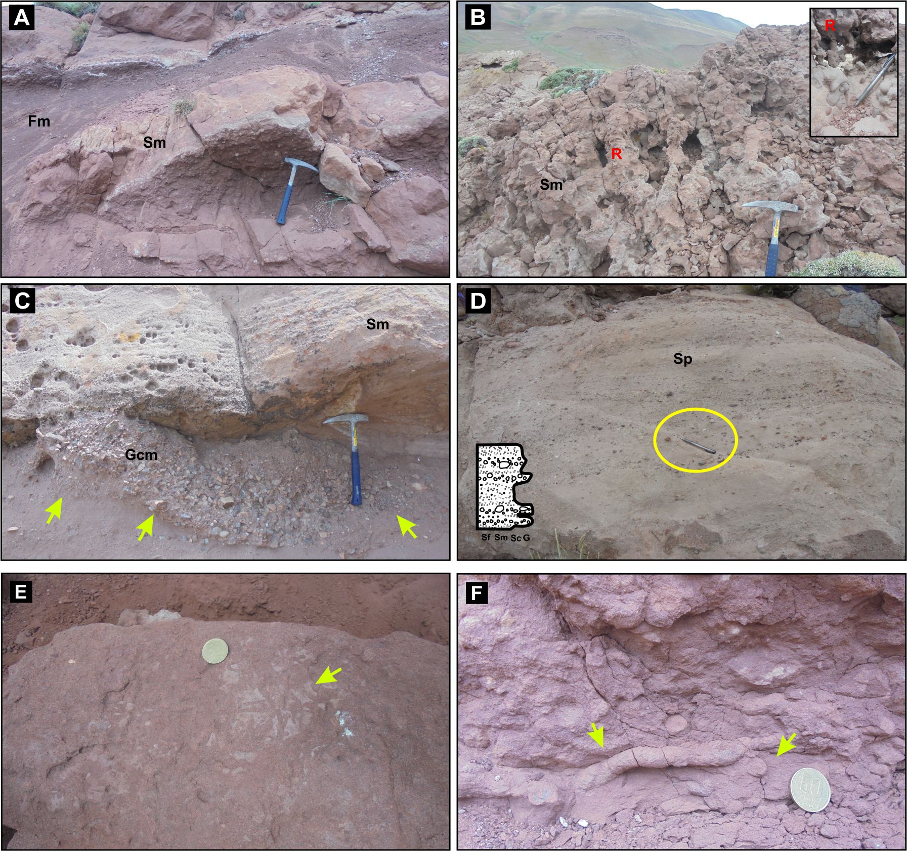 Nine facies were established (Table 1, Gómez et al., 2016a, b). Conglomeratic facies of variable lateral extension (from 1 to 14 m) and thickness (up to 5 m) present lenticular and chaotic geometries. Clast-supported orthoconglomerates (Gcm, Gct) are the most abundant facies while matrix-supported orthoconglomerates (Gmm) are present in a lower proportion. They crop out as continuous depositional cycles that begin with coarse-conglomeratic, followed by coarse-sandstone facies and finish with medium to fine sandstone facies (Sp, Sm) with bioturbation (Sm). The sandstone facies not only appear associated with conglomeratic facies, but also appear showing both the ribbon and sheet geometries as individual bodies (Sp, Sm, Sh). On the other hand, mudstone facies are represented by tabular and sheet geometries, often semi-covered and with an important thickness (from 1 to 80 m) representing the major type of deposit in Vega Grande area (Fm, Fl, Fr).