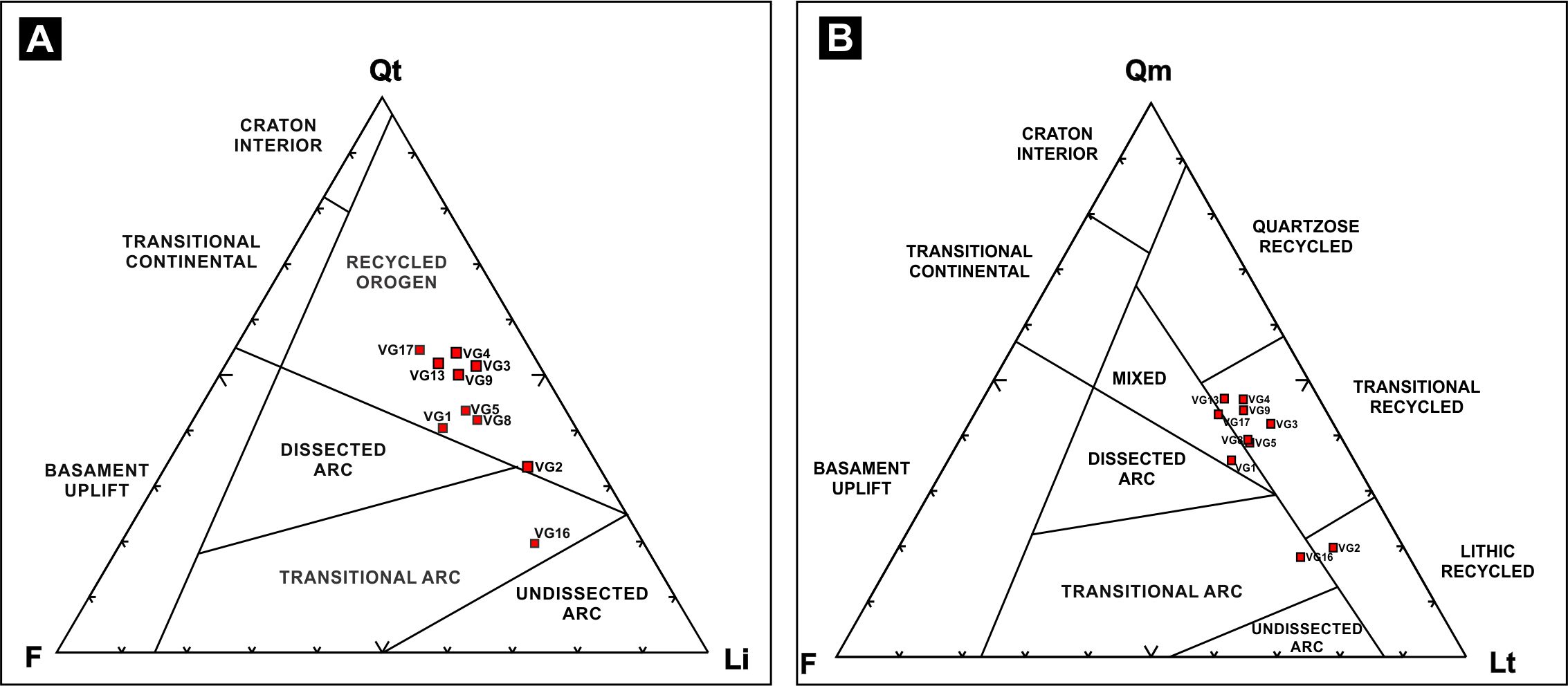 Sandstones modal analysis will be used in this study to identify the source area. The recalculated modal composition for the sandstones (Table 2) was plotted on the provenance graphs of Dickinson et al. (1983). Both graphs indicate that the analyzed samples mostly fall in the recycled orogen (Fig. 9A) and transitional recycled (Fig. 9B) fields, although some of them have a transitional and mixed arc provenance (Fig. 9B). Embayment on the quartz supports active volcanic processes, while analcime as cement (sample VG9) indicates volcanic material alterations. The latter appears filling pores and completely sealing the porosity present.