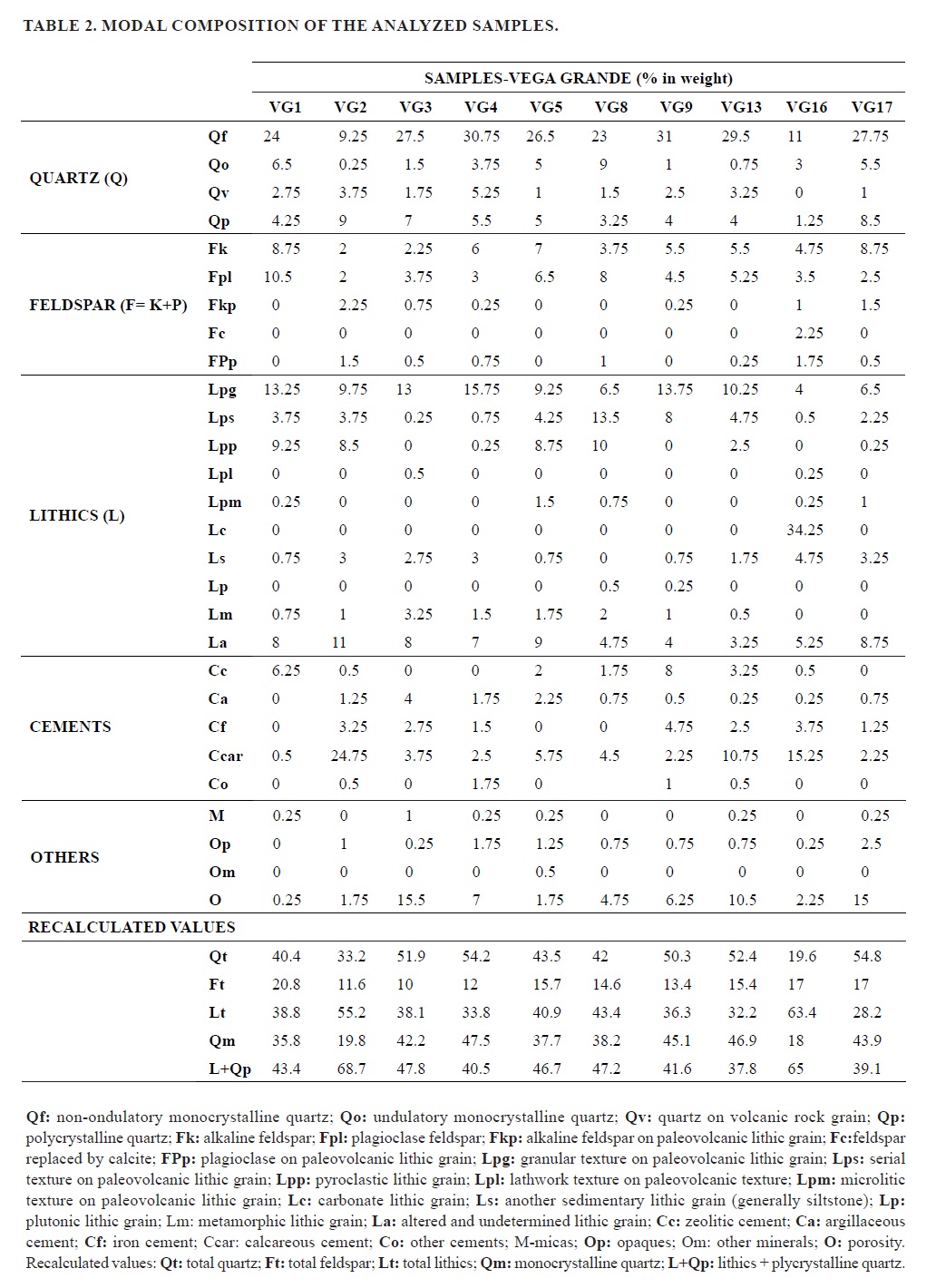 The average quartz proportion in the samples is 55% and the predominant variety is the monocrystalline with straight extinction one. Quartz with ondulatory extinction (4%) was also recognized, as well as quartz as a fragment of a volcanic rock (on average 2%). Embayment quartz with volcanic matrix preservation was observed in samples VG1, VG4 and VG17. No clear tendency towards the base or the top regarding the quantity of quartz could be observed in the analyzed stratigraphic section, although the samples with an important proportion of altered lithic clasts or carbonates (samples VG2 and VG16) recorded a low quantity (Fig. 8F). The polycrystalline quartz proportion (on average 5%) is relatively low throughout the section.