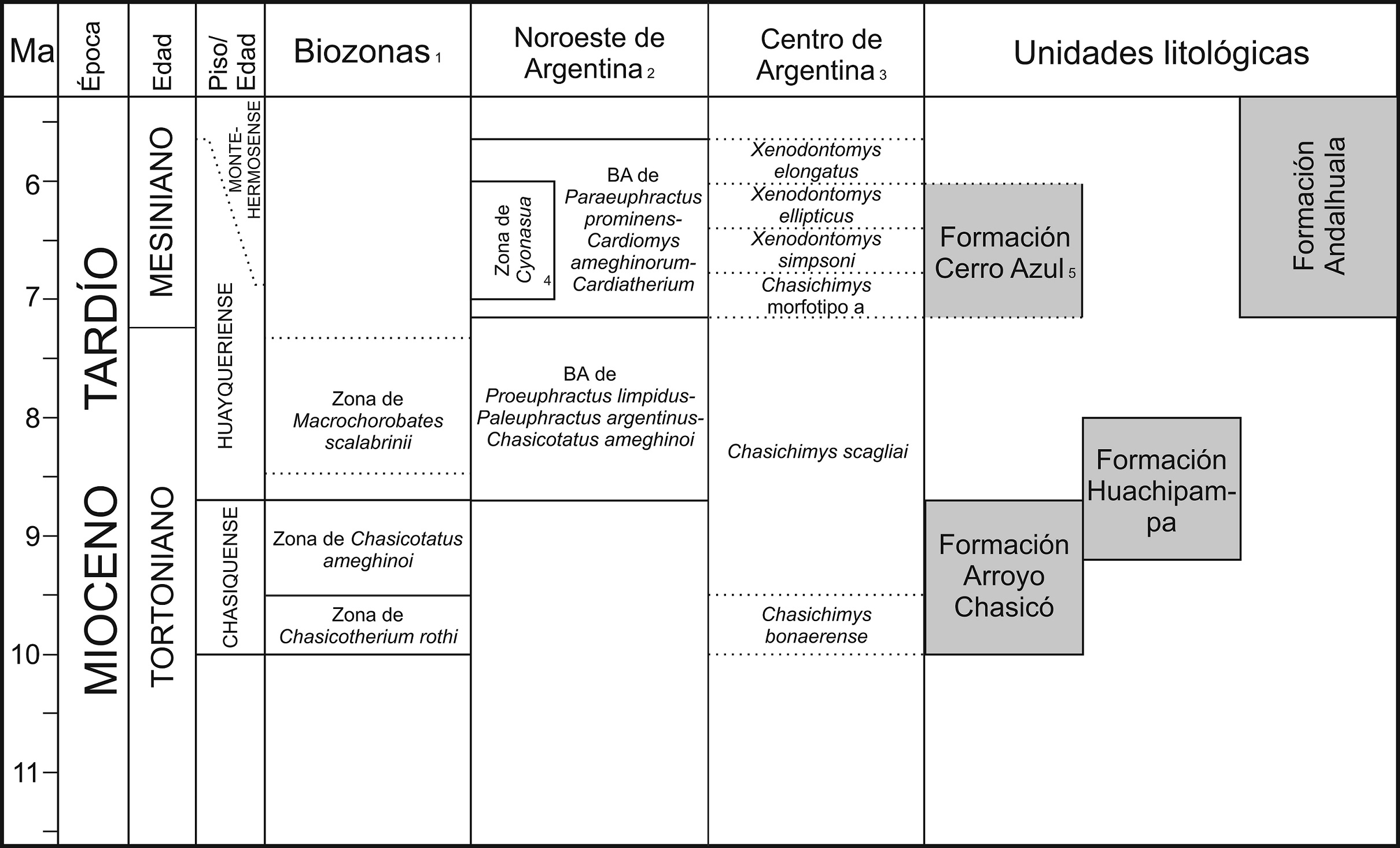 FIG. 2. Cuadro cronoestratigráfico de América del Sur. 1. Cione y Tonni, 2001, 2005; 2. Esteban et al., 2014; 3. Deschamps, 2005; Verzi et al., 2004, 2008; 4. Reguero y Candela, 2011; 5. Formación Cerro Azul en Salinas Grandes de Hidalgo. Las líneas punteadas indican límites sin edades absolutas.