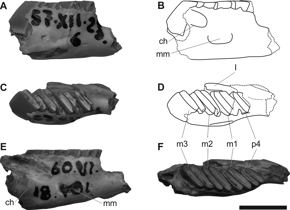 Descripción comparativa. La porción preservada de la mandíbula es pequeña, similar en tamaño a los especímenes de Lagostomus telenkechanum de la Formación Arroyo Chasicó, a L. antiquus y a los individuos más pequeños de L. pretrichodactyla y L. euplasius. La muesca masetérica, sitio de inserción de la porción infraorbital del músculo masetero medio (sensu Woods y Howland, 1979), se encuentra entre el m1 y el m2, como en el material de Lagostomus telenkechanum proveniente de la Formación Arroyo Chasicó. La porción anterior de la cresta horizontal se encuentra a nivel del límite m2-m3, y está desconectada de la muesca masetérica, ubicándose dorso-posteriormente a esta última, igual que en otras especies de Lagostomus.