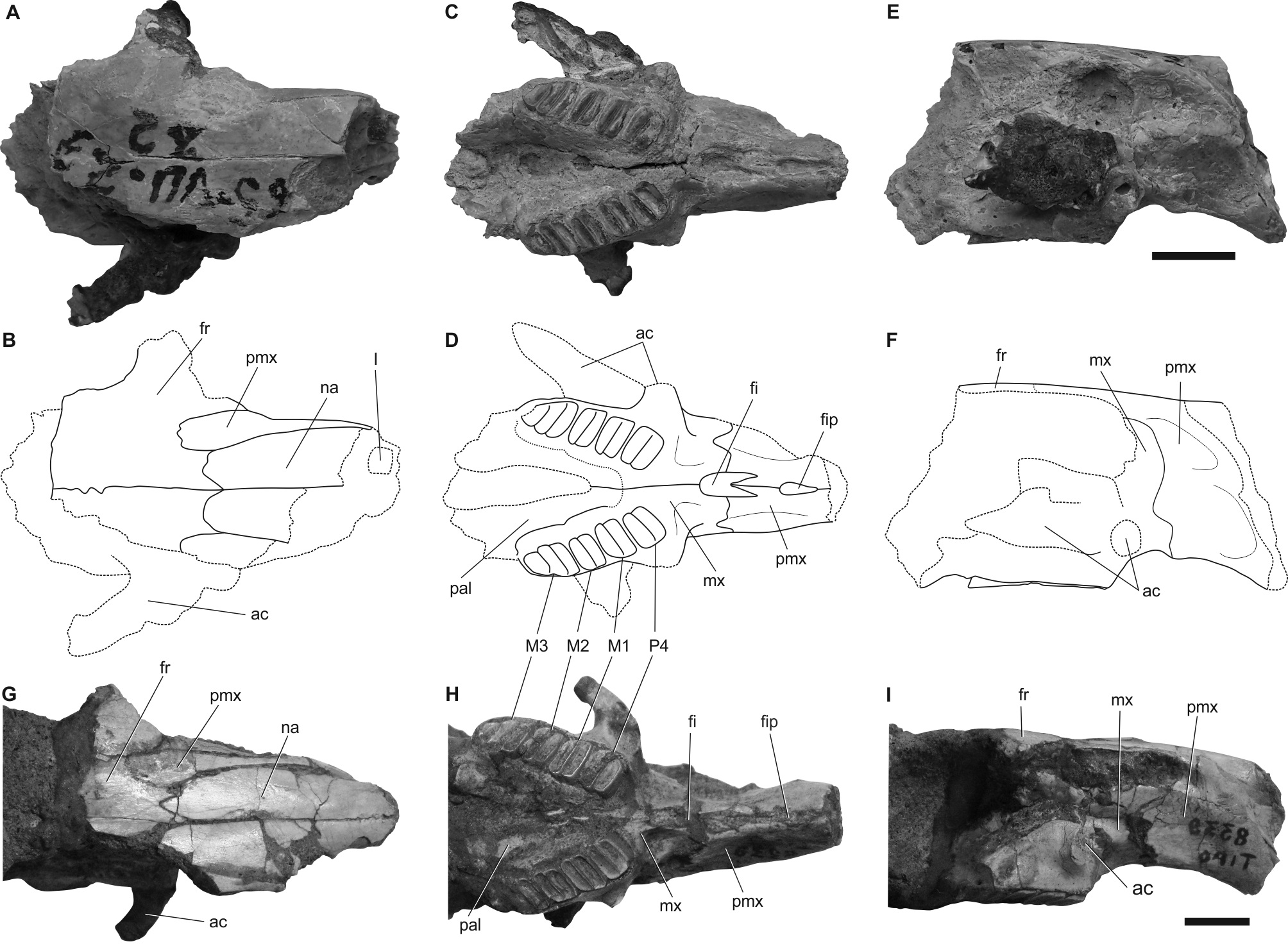 Descripción comparativa. La porción preservada del cráneo se asemeja en tamaño a individuos de Lagostomus euplasius. En la vista dorsal, los premaxilares sobrepasan posteriormente a los nasales (Fig. 5A-B), como en individuos de Lagostomus pretrichodactyla provenientes de Catamarca (Fig. 5G), y en L. incisus y L. euplasius; estos se diferencian de L. compressidens, L. cavifrons y L. maximus. El foramen interpremaxilar es ancho y elongado anteroposteriormente (Fig. 5C-D), rasgo compartido por Lagostomus pretrichodactyla, L. euplasius, L. compressidens y por la mayoría de los individuos de L. maximus. El foramen incisivo es grande y ancho en su parte posterior (Fig. 5C-D). Los procesos palatinos de los premaxilares son fuertes y posteriormente dirigidos, sobresaliendo ventralmente al plano del diastema, y diferenciándose de Lagostomus incisus. La pobre preservación del cráneo no permite una comparación más detallada.