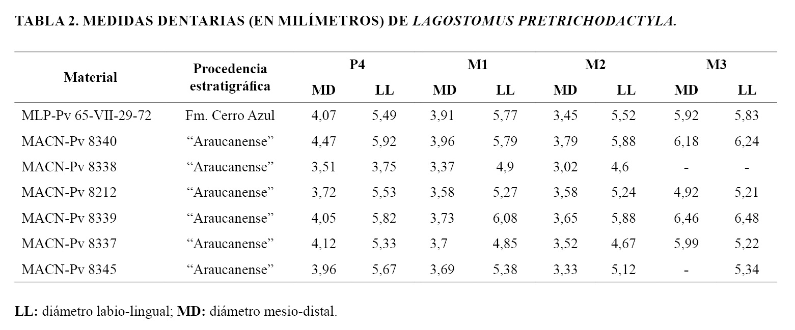 Las proporciones de los molariformes superiores son semejantes a aquellas de los especímenes de Lagostomus pretrichodactyla reportados por Rovereto (1914) y Marshall y Patterson (1981) para la provincia de Catamarca (ver Tabla 2 y Figs. 5C, 5D, 5H y 6), aunque son menos comprimidos mesio-distalmente que los de L. telenkechanum, L. euplasius y L. incisus; se asemejan a los de L. compressidens, L. cavifrons y L. maximus.
