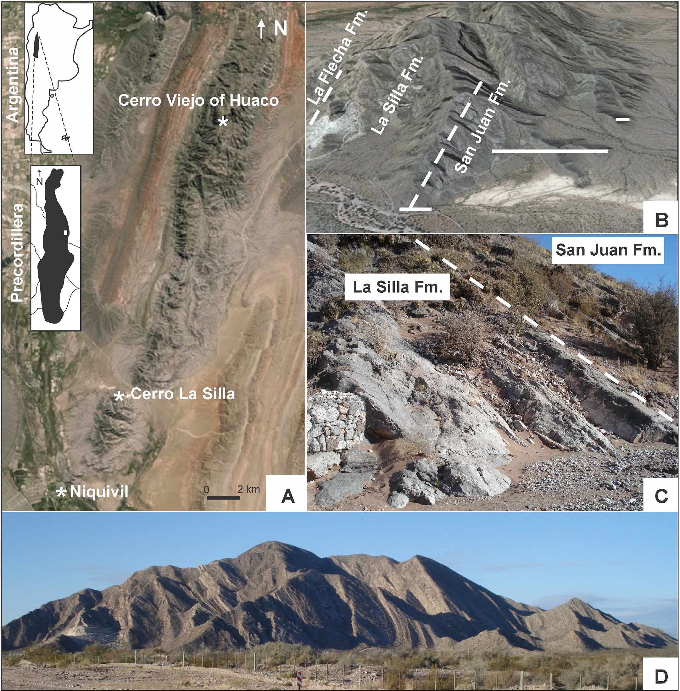 The Cerro La Silla, in the Central Precordillera, is located 15 km southeast of Jáchal City (Figs. 1 and 2), San Juan Province. The study section can be accessed by vehicle through the National Route No. 40.