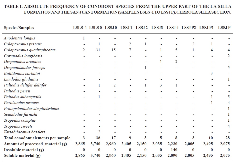 Finally, Buggisch et al. (2003) indicated that the upper San Juan Formation at the Cerro La Silla, would correlate with the Baltoniodus navis, Paroistodus originalis, and Microzarkodina parva zones of the Baltic biostratigraphic scheme. However, the present records constrain the deposits located from the base of the second reef level to the top stratum of the San Juan Formation exposed in the section (87.4 m) to the Baltoniodus triangularis-Tripodus laevis Zone.