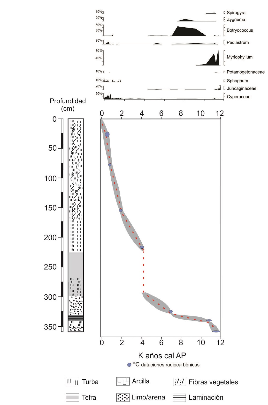 De acuerdo con el registro palinológico que representan la comunidad local, entre 11.500 y los 10.000 años cal AP la dominancia de Myriophyllum, acompañada por Potamogetonaceae (probablemente Potamogeton), y algas clorofíceas como Spirogyra, Zygnema, Botryococcus y Pediastrum indica un lago somero con un anillo incipiente de Juncaginaceae y Cyperaceae. Algas cocales como Pediastrum son componentes de la comunidad planctónica de lagos, tanto profundos como someros (Shubert, 2003). Si bien esta es una característica propuesta y aceptada para el estudio de los lagos someros de la pampa (Argentina) (Dangavs, 2005), observaciones en campo, y estudios preliminares actuales aún no publicados nos dan la suficiente información para inferir que se estaría desarrollando una laguna clara somera con una profundidad ˃4 m entre los 11.500 y 10.000 años cal AP. Las Zygnemataceae (como Spirogyra y Zygnema) son algas filamentosas comunes en la costa de ambientes dulceacuícolas lacustres de aguas someras (Van Geel et al., 1996), ocasionalmente constituyen floraciones en la zona litoral formando masas flotantes entremezcladas con otras algas filamentosas. Además, Botryococcus forma parte del fitoplancton o del metafiton de cuerpos de agua (Shubert, 2003). La presencia de estos palinomorfos coincide con los depósitos laminados y arcillosos para el mismo período. Entre 10.000 y los 7.000 años cal AP, una fase dominante Pediastrum-Botryococcus sugiere un aumento en los niveles de agua del lago o un aumento en la extensión del espejo de agua.