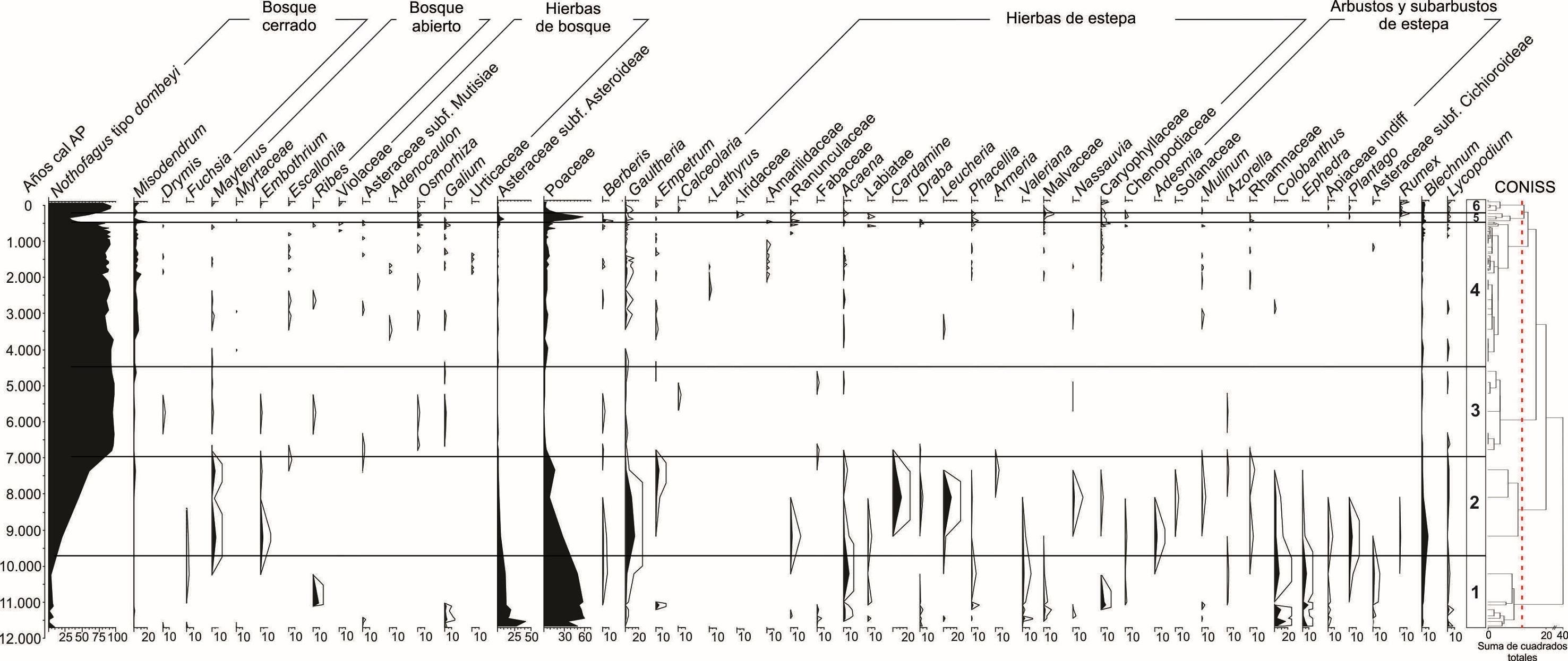 El porcentaje de los taxones se calculó a partir de 3 sumas. La primera suma “Polen” incluyó a los taxones indicadores de bosque cerrado y bosque abierto (Nothofagus tipo dombeyi, Misodendrum, Drymiswinteri, Maytenus, Escallonia, Ribes), hierbas de bosque (Asteraceae subf. Mutisiae, Adenocaulon, Osmorhiza, Galium), hierbas de estepa (Calceolaria, Iridaceae, Ranunculaceae, Chenopodiaceae, Nassauvia, Brassicaceae, Caryophyllaceae, Euphorbiaceae, Fabaceae, Astragalus, Vicia, Geraniaceae, Lamiaceae, Malvaceae, Plumbaginaceae, Polemoniaceae, Polemonium, Polygala, Acaena, Valerianaceae, Valeriana, Boraginaceae, Oxalis, Calyceraceae, Arjona, Armeria, Leucheria, Perezia, Saxifraga, Phacelia, Tristagma, Lathyrus y Luzula), arbustos y subarbustos de estepa (Adesmia, Lycium, Solanum, Mulinum, Azorella, Discaria, Ephedra tipo frustillata, Apiaceae, Schinus, Oreopolus), higrófitas (Cyperaceae, Epilobium, Triglochin, Gunnera, Polygonum, Gentianella, Campanulaceae), Asteraceae subf. Asteroideae, Poaceae, Berberis, Empetrumrubrum, Gaultheria, Rosaceae, Orchidaceae y Santalaceae. La segunda suma “Total” incluyó, además de la suma “Polen”, a Plantago, Asteraceae subf. Cichorioideae y Rumexel porcentaje de esporas (Lycopodium magellanicum y Blechnum) se cuantificó a partir de la suma “Total” + Esporas. Los gráficos se realizaron con el programa TILIA.GRAPH (TGView 2.0.2; Grimm, 2004).