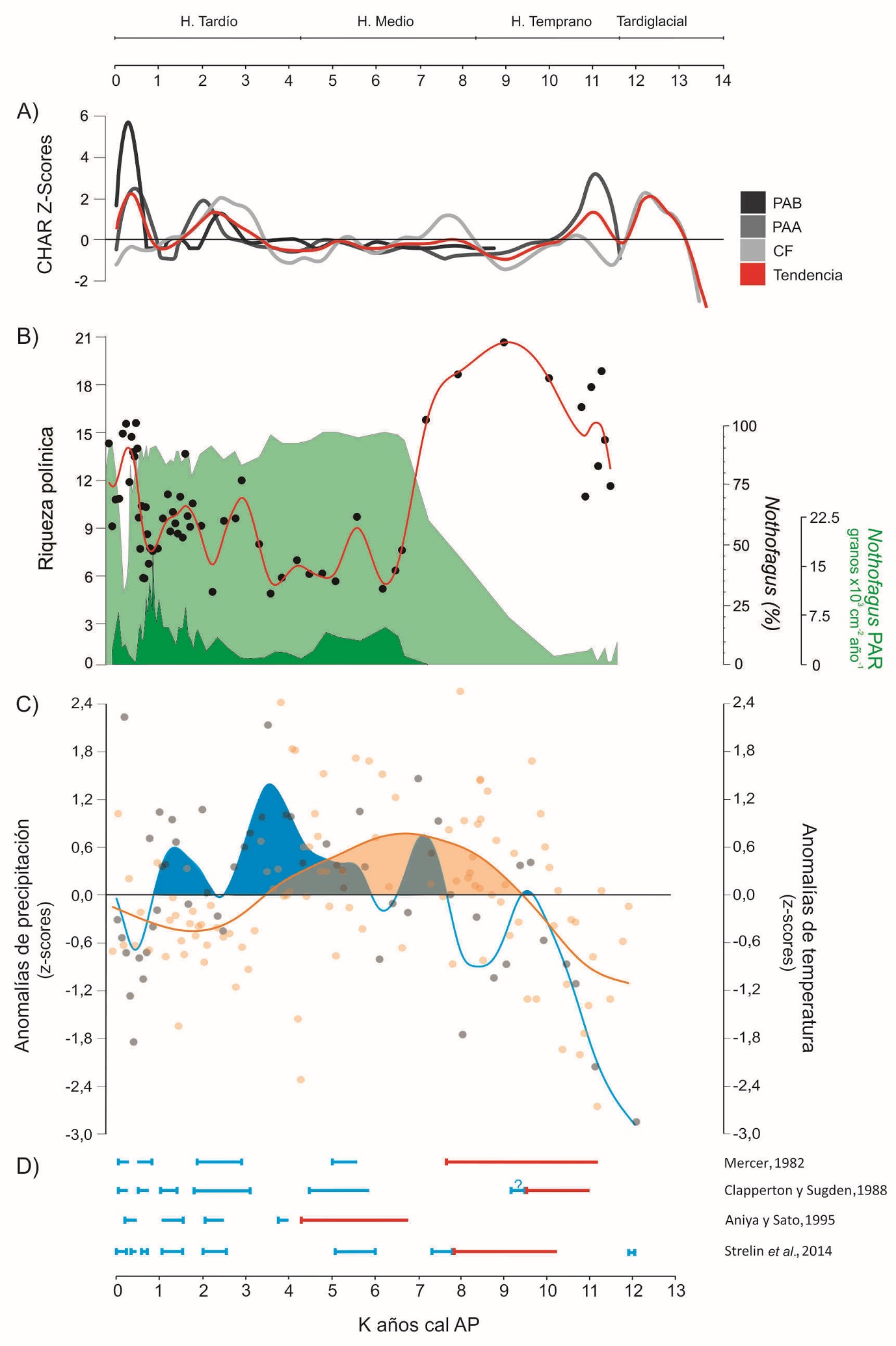 El Holoceno tardío se caracteriza por presentar indicadores con señales diversas dependiendo de la ubicación geográfica de los registros paleoecológicos. A partir de los ca. 5.000-4.000 años cal AP la asimetría en los patrones de los registros paleoclimáticos a diferentes latitudes de la Patagonia, coincide con el comienzo de la variabilidad climática asociada al ENSO y el SAM (Oscilación Anular Sur) (Fletcher y Moreno, 2012; Moreno et al., 2014; Nanavati et al., 2019). Los eventos El Niño están estrechamente asociados a la ocurrencia de incendios en especial al norte de los 44° S, ya que durante estos eventos el cinturón de tormentas asociado a los westerlies se desplazaría a altas latitudes. El mismo efecto se produce durante la fase positiva del SAM.