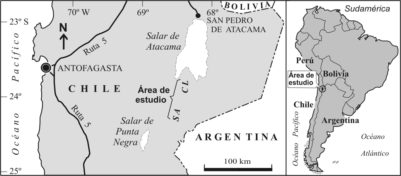 Fig. 1. Ubicación del área estudiada, en la precordillera de Antofagasta entre los salares de Atacama y Punta Negra. CL: Cordón de Lila, SA: Sierra de Almeida.