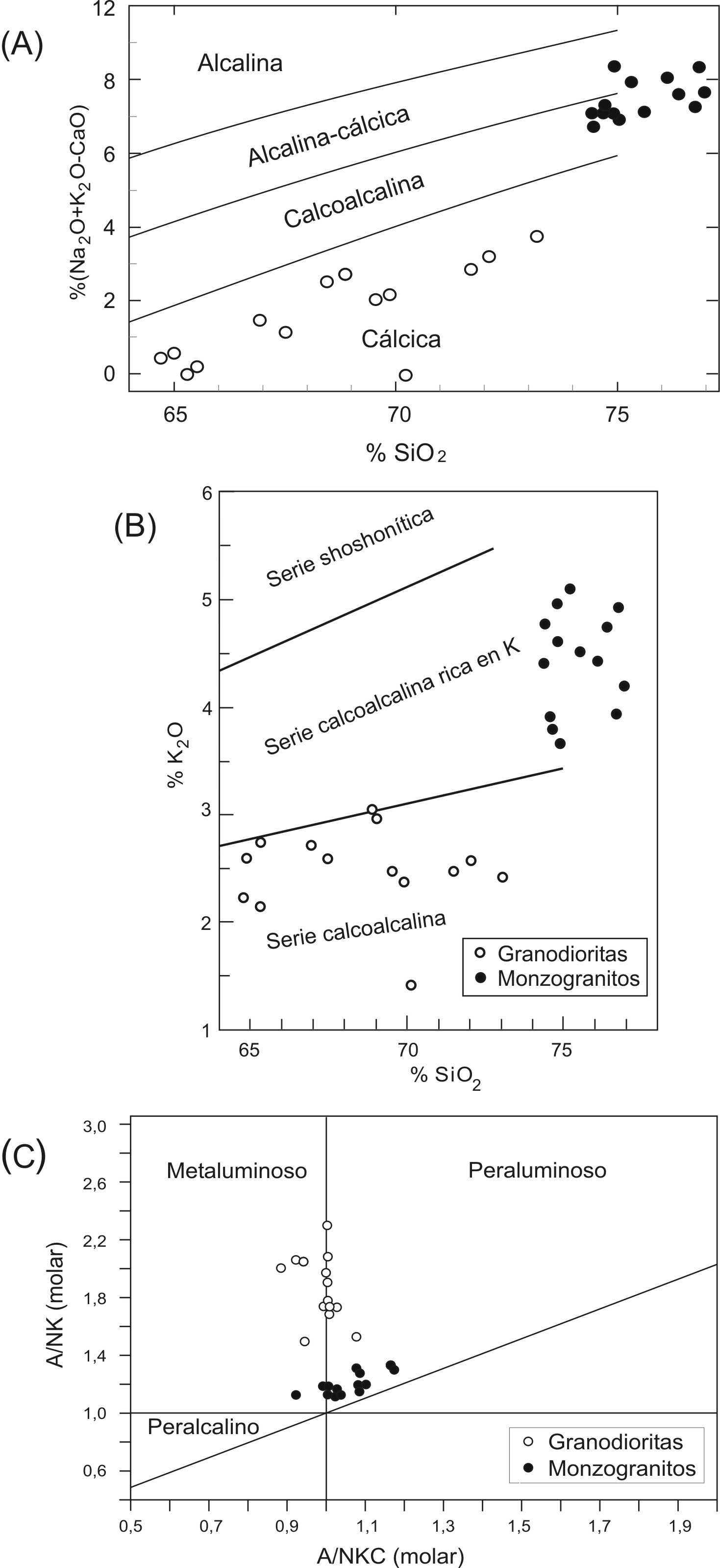 Fig. 5. A. Diagrama Na2O+K2O-CaO versus SiO2 de Frost et al. (2001) para las granodioritas (círculos vacíos) y para los monzogranitos (círculos llenos), contenidos en peso %. B. Distribución de las granodioritas (círculos vacíos) y de los monzogranitos (círculos llenos) en el diagrama de SiO2 versus K2O (Rickwood, 1989), contenidos en peso %. C. Diagrama de Shand (1943), A/NKC versus A/NK, para granodioritas y monzogranitos. La división transversal es tomada de Maniar y Piccoli (1989).
