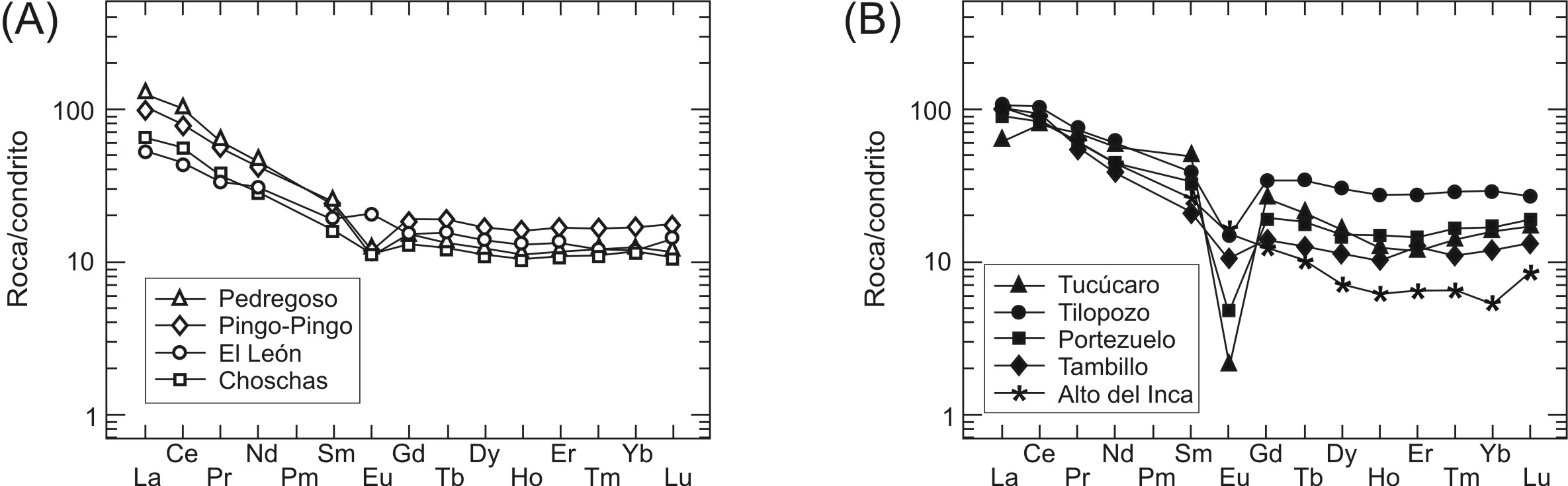 Los patrones de tierras raras normalizados a los valores de condrito (Boynton, 1984), muestran que las granodioritas se caracterizan por un enriquecimiento de las tierras raras livianas (TRL) con respecto a las pesadas (TRP) y una anomalía de Eu menor (Fig. 7A). Las primeras presentan un patrón inclinado con un marcado descenso desde La a Sm y una disposición horizontal de las TRP con una anomalía negativa leve de Eu, incluso positiva en el caso del Plutón El León, entre ambas. Los monzogranitos presentan un patrón de distribución ligeramente enriquecido en TRL respecto a las TRP, caracterizado por una conspicua anomalía negativa de Eu (Fig. 7B).