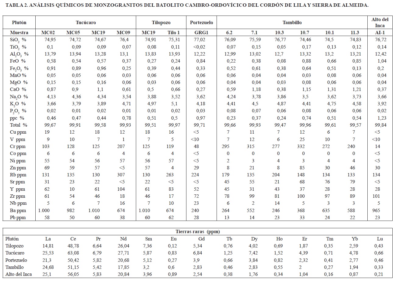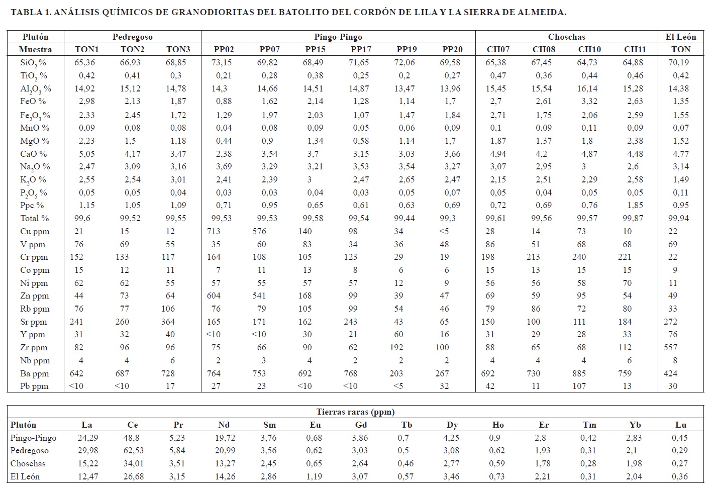 El contenido de elementos mayores y en trazas determinado en las muestras analizadas se presenta en las tablas 1 y 2 para las granodioritas y los monzogranitos, respectivamente. La mayor parte de los valores de las determinaciones de pérdidas por calcinación (ppc) en cada muestra son menores al 1% en peso, lo cual es considerado como un indicador de que las muestras analizadas presentan un bajo grado de alteración, lo que permite inferir que su composición química no ha sufrido cambios significativos.