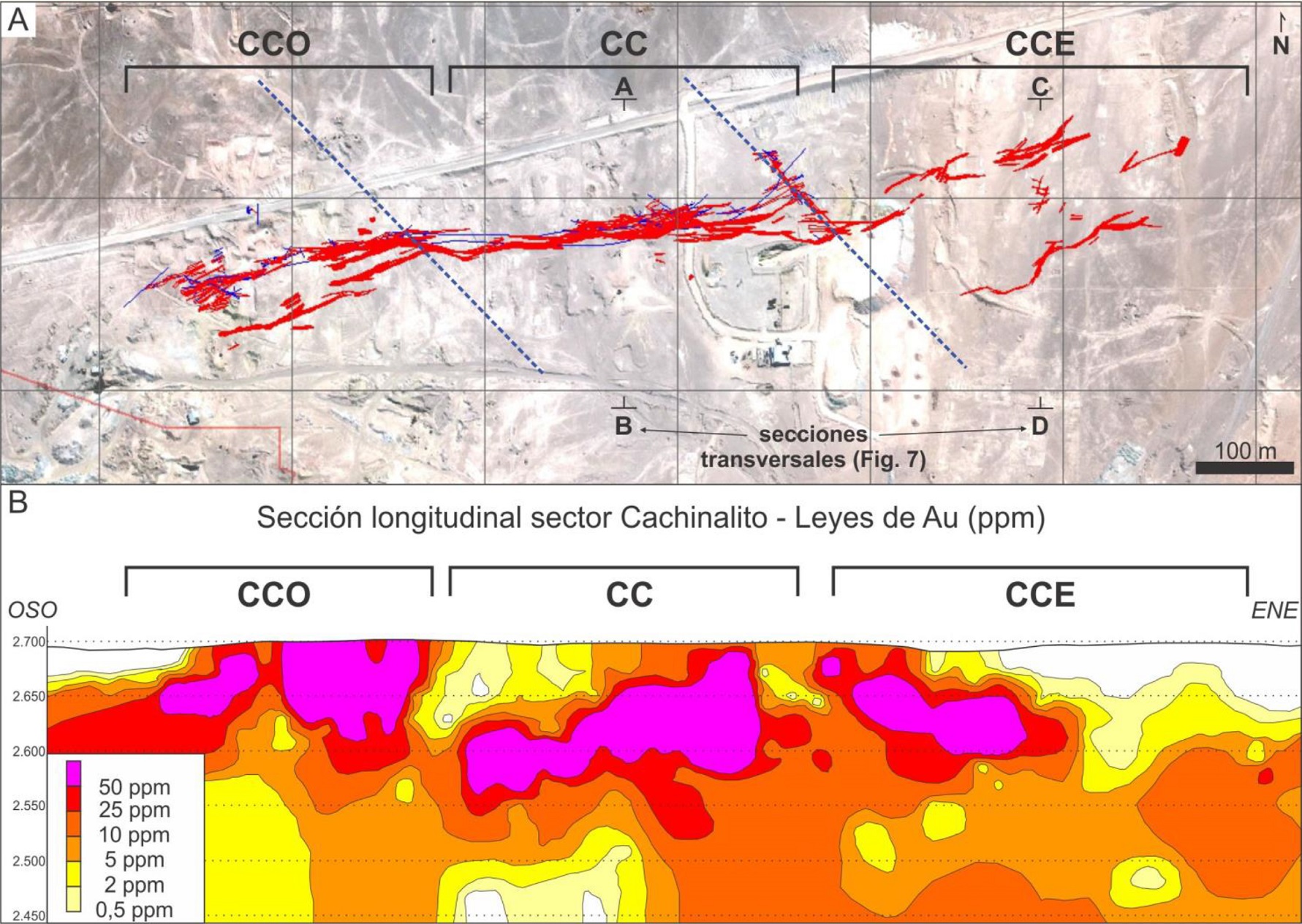 La distribución de las leyes de Au sobre la sección longitudinal (N85° E) de Cachinalito (Fig. 4B), muestra una clara zonación vertical de las concentraciones auríferas por metro de potencia de ledge. Se aprecia como los valores superiores a 25 ppm/m de Au se encuentran agrupados entre las cotas 2.525 y 2.675 m s.n.m.