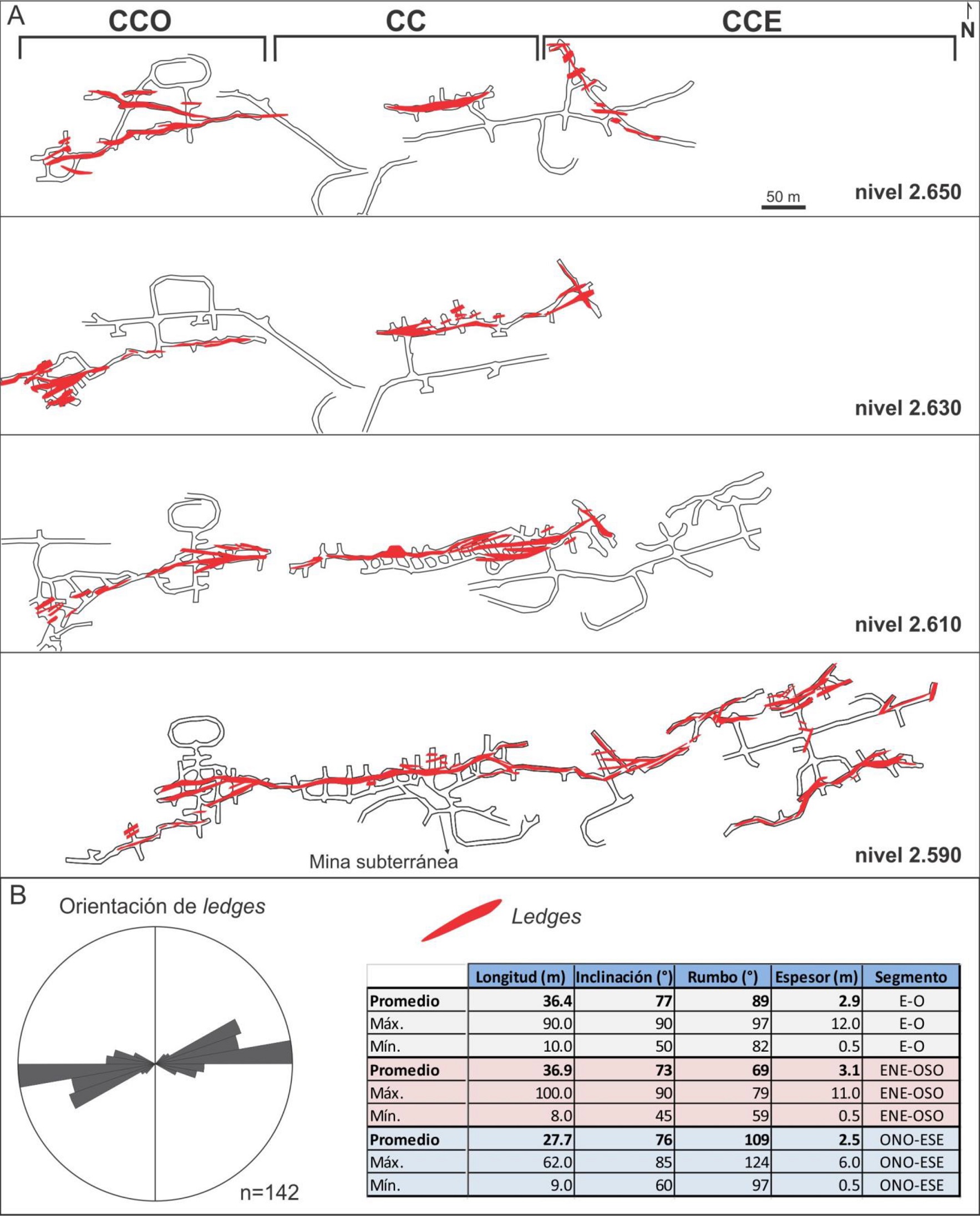 A partir de mapeos de ledges en los distintos niveles, secciones y la geoquímica de canaletas de interior mina (Figs. 5 y 6), se estableció una zonación de sectores de alta ley, las que se separaron en intervalos de 2 a 5 g/t de Au (clavos de alta ley) y >5 g/t de Au (clavos de muy alta ley) (Fig. 6A). Estos intervalos permiten definir los clavos mineralizados según su orientacion, inclinación, longitud y espesor (n=345). Para la caracterización de los ledges de distintas orientaciones se midieron y analizaron variables como rumbo, inclinación, longitud y espesor (Fig. 5A; n=142). Posteriormente se realizó un análisis estadístico de los datos en ambos casos (Figs. 5B y 6B).