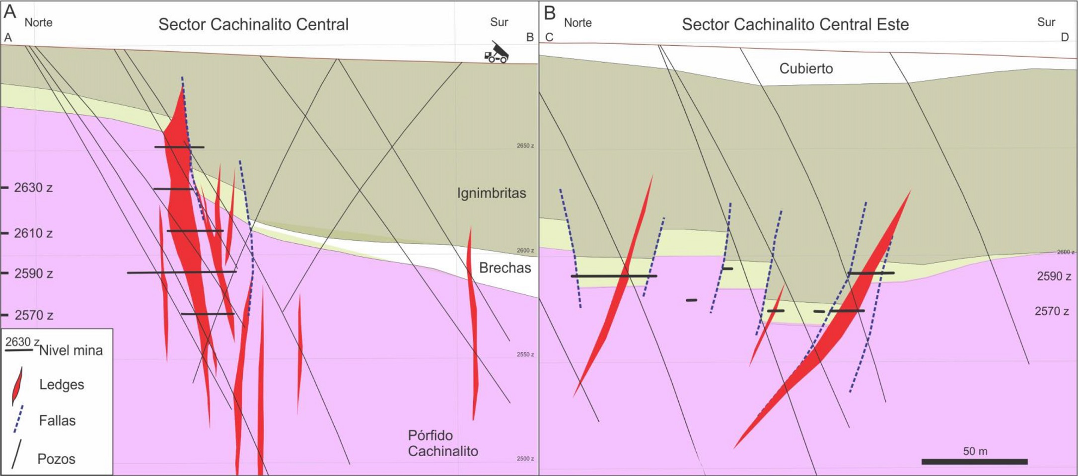 El sistema de ledges del sector Cachinalito presenta una morfología discontinua, de orientación general ENE-OSO, conformada por tramos que cambian abruptamente de dirección, espesor, longitud y/o inclinación en pocos metros de corrida. Ellos definen una estructura sigmoidal, generada a partir del crecimiento de fallas por donde circularon los fluidos hidrotermales responsables de la génesis del yacimiento. De acuerdo con los antecedentes de campo (Figs. 4 y 7), la distribución espacial de los ledges está directamente asociada con las fallas y fracturas (Fig. 4). Las relaciones de corte entre las fallas, rocas de caja (56-52 Ma) y edad de la actividad hidrotermal (43-49 Ma) permiten sugerir la contemporaneidad entre la actividad de las fallas y el proceso mineralizador. En este contexto, estas estructuras habrían canalizado la circulación de los fluidos hidrotermales y, al mismo tiempo, habrían continuado su actividad tectónica durante la formación del yacimiento, como queda registrado en los indicadores cinemáticos presentes en los ledges, situación ampliamente documentada para este tipo de depósito (Cox et al., 2001; Nelson, 2006).