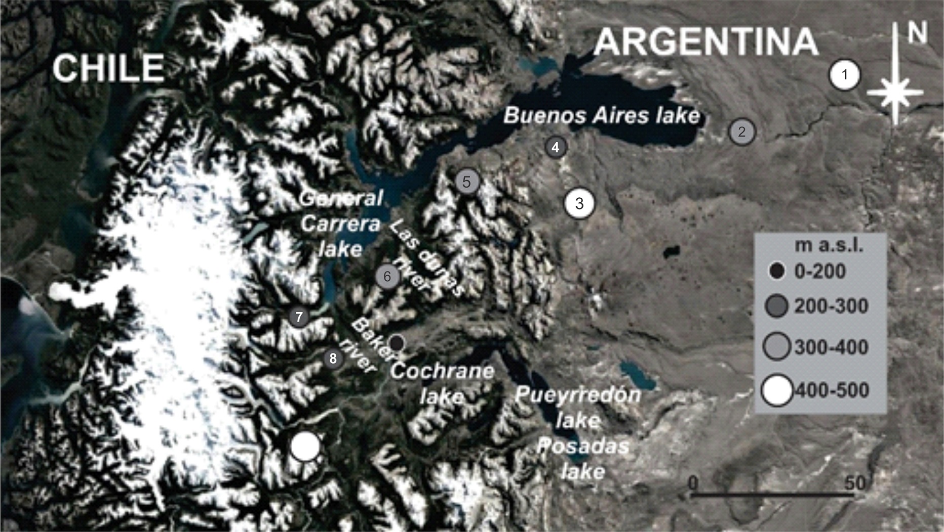 At the Argentine side, the maximum altitude of the glaciolacustrine sequences diminishes towards the west. At the Chilean side, the altitudes of the former lake levels diminish northwards (Fig. 2). At the Argentine territory the altitudes are higher as the distances to the present lakes increase. The highest levels are at about 500 m over MSL suggesting the maximum extension of the largest paleolake.