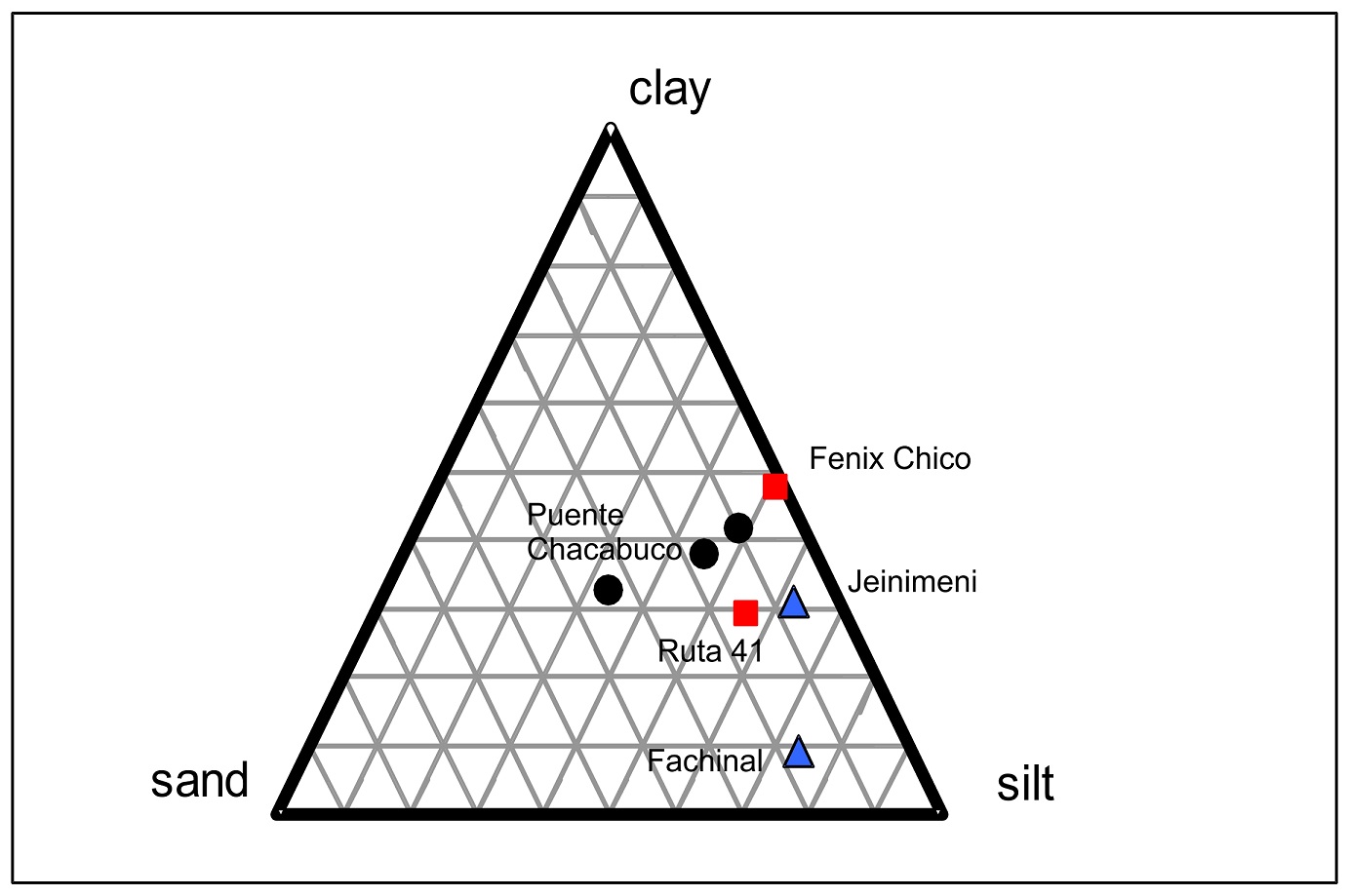 The samples were taken both in the Argentine (Fenix Chico River, Route 41 and Jeinimeni River) and in Chilean (Fachinal, Chacabuco Bridge) territories. Their compositions are dominated by clay and silt fractions.