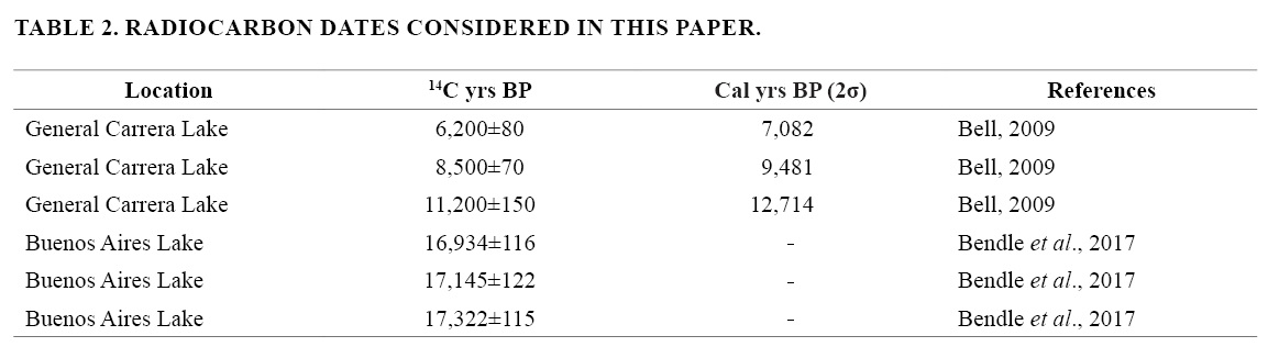 TheBuenos Aires-General Carrera Lake is the second largest lake in South America. It is occupying a glacial valley oriented W to E across the Patagonian Andes Cordillera where several Quaternary glaciations have occurred (Ton-That et al., 1999; Hein et al., 2009; Lagabrielle et al., 2010). The orientation of these lakes parallel to the dominant westerly winds causes seiches, mainly at the Argentine sector where the regional topography is not an obstacle to the wind action (Isla et al., 2010; Richter et al., 2010). At the southern shore of the General Carrera-Buenos Aires Lake, the LasDunas River has built seven Gilbert-type deltas (Bell, 2009). The oldest is at 650 m over present sea level (MSL) and assumed to be constructed ca. 13,000 years ago. The youngest non-operative delta (second delta) was probably constructed 8,500 years ago. The present delta is assumed to be stable at an altitude of 201 m for the last 6,200 years (Bell, 2009). The altitudes of these delta terraces above MSL along the General Carrera-Buenos Aires Lake shoreline were analyzed to discern its evolution (Bourgois et al., 2016) although their interpretations are not so simple (Martinod et al., 2016). An ice cover persisted in General Carrera- Buenos Aires Lake area until at least 16,934±116 cal yrs BP (Bendle et al., 2017). Moraine successions corresponding to the maximum glacier extensions (23,000 yrs BP; Fénix V Moraine) were established either for the General Carrera-Buenos Aires (Kaplan et al., 2004) and Pueyrredon-Posadas-Salitroso-Ghio lakes (Hein et al., 2010). Between 16,000 and 15,600 years BP, the Chacabuco valley, located between General Carrera-Buenos Aires and Pueyrredon-Posadas valleys, was reported free of ice and colonized by herbs, shrubs and evergreen forests (Villa-Martínez et al., 2012).