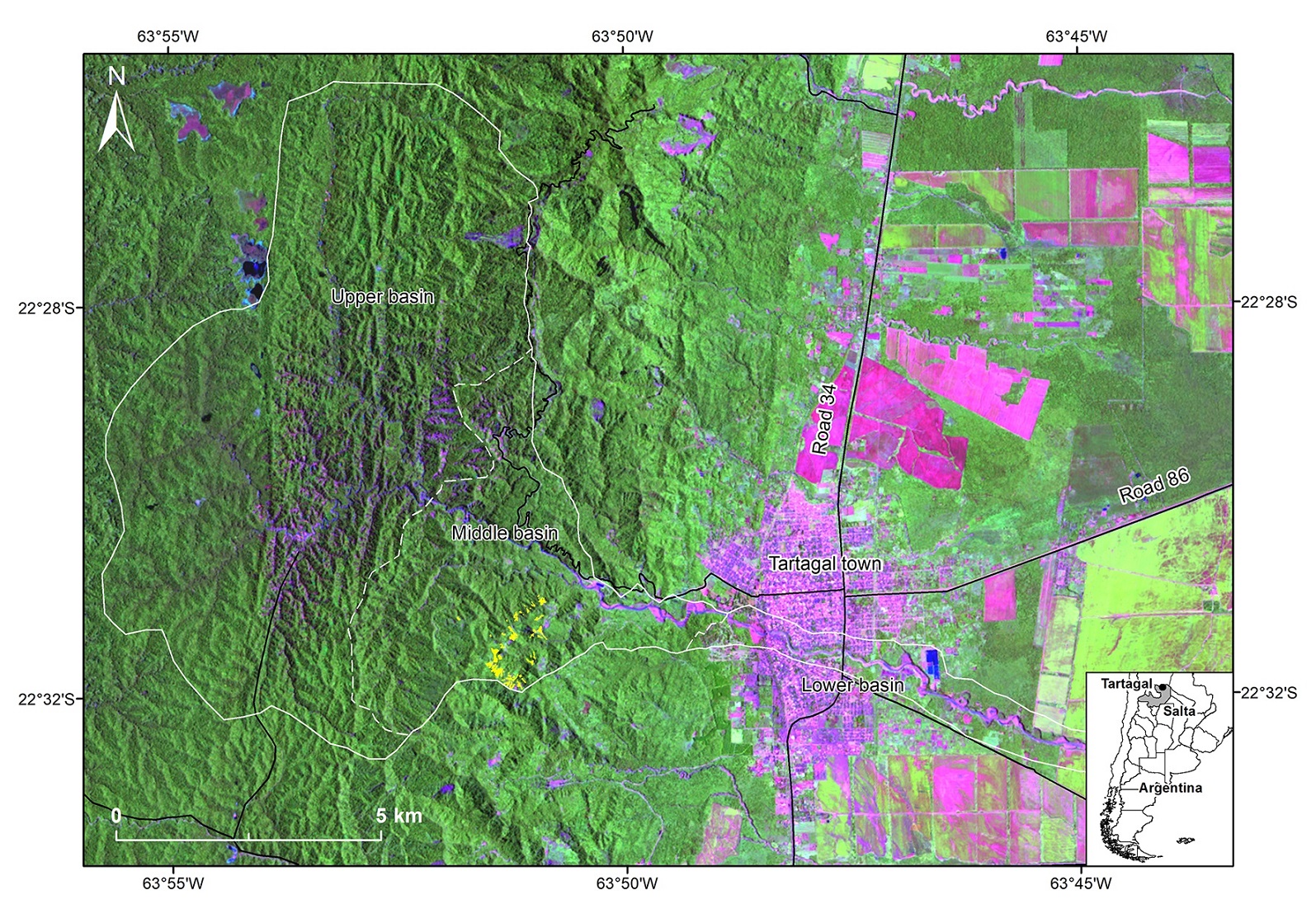 The Tartagal River basin is located in San Martin Department, Salta province, NW of Argentina. The river length is 19 km up to the bridge in the town of Tartagal. The basin covers almost 90 km2 and extends along an altitudinal range between 400 and 1,200 meters above sea level (m a.s.l.). The mean elevation is 730 m a.s.l. and the slope ranges between 0 and 84° around a mean of 12° . The upper and middle sub-basins occupy 62 and 21 km2, respectively, and altogether they represent more than 90% of total basin’s surface. The town of Tartagal is within the lower river basin at 500 m a.s.l. at the foot of the Sierras Subandinas (Fig. 1) and it had a population in 2010 of almost 80,000 inhabitants (http://www.indec.gob.ar) (Last visit 18/12/2020).
