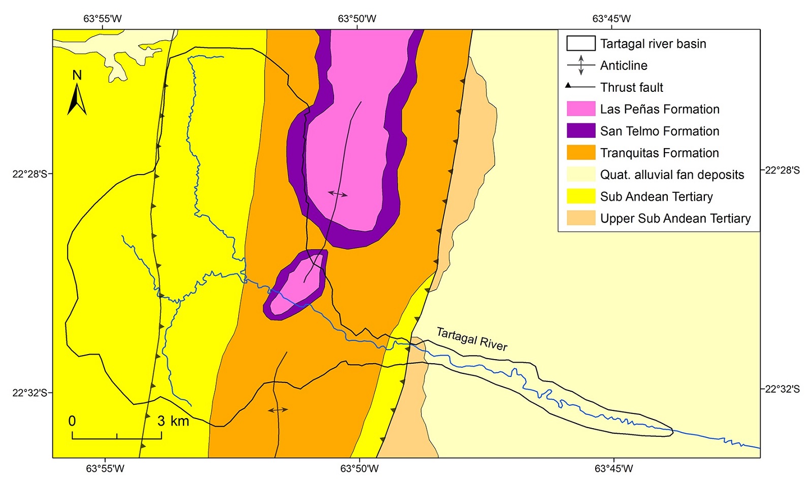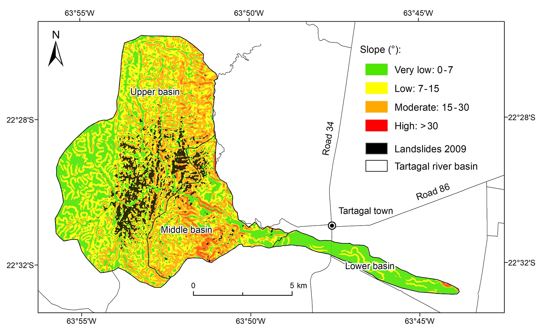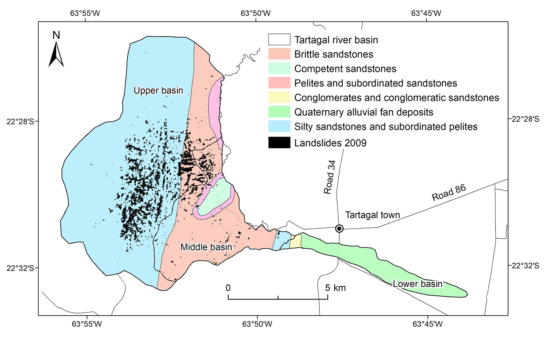 An asymmetric anticline that heads along a sub-meridian and southwards characterizes the hills, where the Tartagal River basin is located (Mingramm et al., 1979) (Fig. 2). At the transition between the upper and middle sub-basins the nucleus is exposed and shows Upper-Paleozoic sedimentites (Las Peñas and San Telmo formations (Padula and Reyes, 1958)). In the eastern and western flanks, the outcrops belong to Tranquitas Formation, which is from the lower/middle Miocene age. This formation includes sandstones, calcareous sandstones and gray-greenish partially competent pelites. The upper river sub-basin is at the western flank of the anticline, where Tertiary deposits outcrop; they consist of sandstones and highly erodible and reddish pelites (Hernández et al., 1996). On the other hand, conglomeratic and median sandstones compose the Tertiary outcrops towards the east (Gebhard et al., 1974). The areas with low slopes are conformed by Paleozoic rocks within deep valleys characterized by straight sections. Conversely, Tertiary sedimentary rocks form asymmetric homoclinal ridges and hogbacks with secondary rivers flowing parallel to the rock bedding. The ridges and hogbacks slopes, formed by highly erodible sandstones and pelites are prone to shallow landslides (i.e., the 2009 events). However, most of the slope-failures in February 2009 took place on soils and colluvial deposits, with some of them also affecting the underlying sedimentary rocks. Bed scour in rivers located at the foot of slopes has also an important role in the induction of slope failure. In the upper basin, where soft rocks (Tertiary) are present, the Tartagal River valley is broad and winding, whereas in the middle basin where rocks are hard (Paleozoic), the valley is straight and narrow. Finally, the town of Tartagal is located at the apex of the alluvial fan of the river of the same name (Fig. 2).