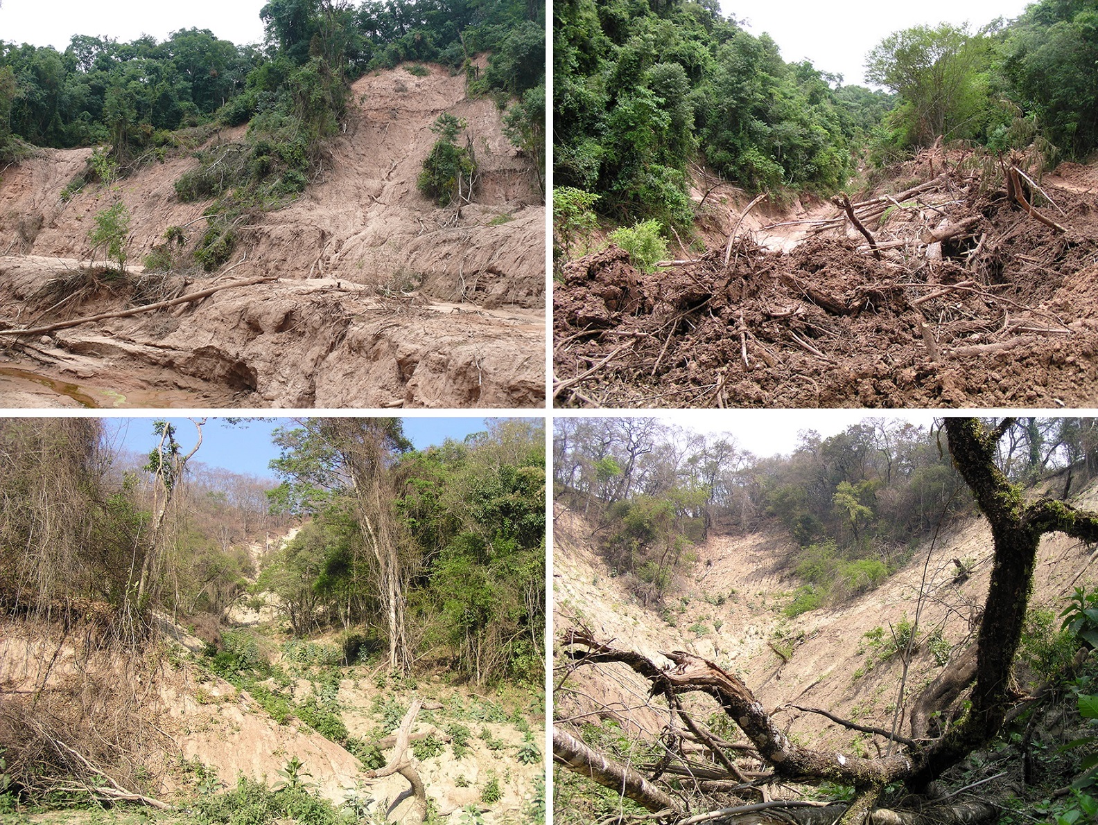 Fig. 3. Photos at top left and top right are a landslide and a debris flow in two sites called Agu. 1 and Agu.2, respectively, in the sector Quebrada del Aguay located towards the W-SW of the basin (S1 in Fig. 4) in the Sub Andean Tertiary (see Fig. 2). The two photos at the bottom are both landslides in two sites called Yar. 1 and Yar. 3 in a zone called Yariguarenda, which lies towards the E-NE (S2 in Fig. 4) within Tranquitas Formation (see Fig. 2).