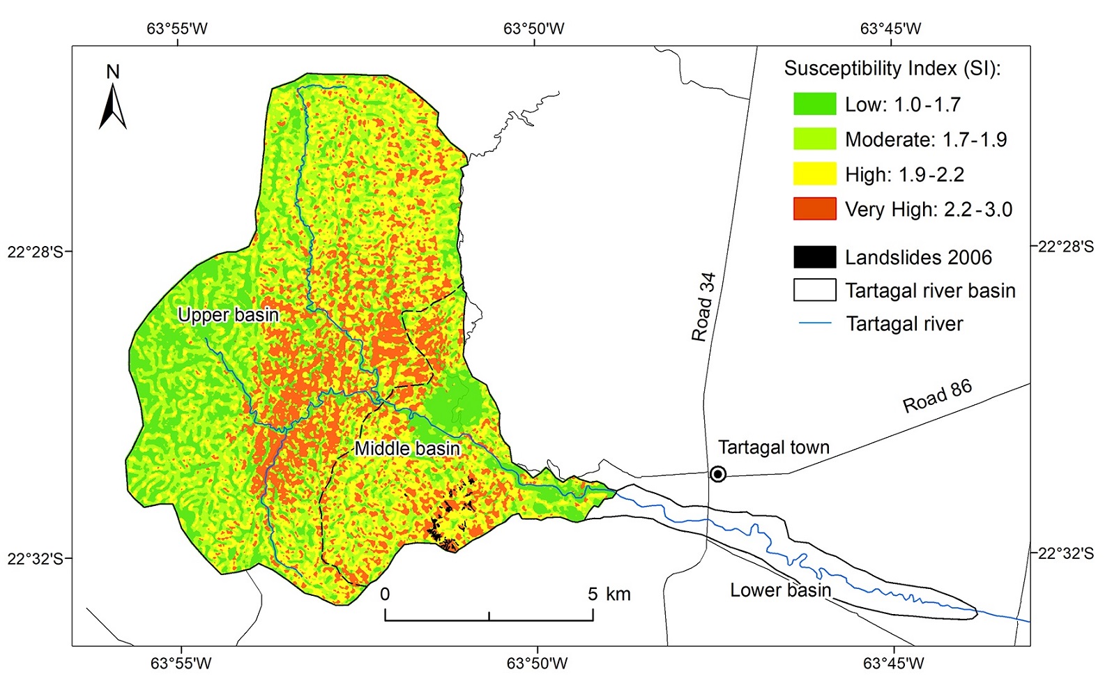 This study resulted in the first map of landslide susceptibility for the Tartagal upper and middle river basins through the implementation of a heuristic model that used as input lithology, slope, curvature and the 2009 landslide inventory. Zones of high and very high susceptibility occupied 25 and 17 km2, respectively, and covered about 50% of the upper and middle basins together. From the remaining half, areas of low susceptibility covered an almost identical surface as very high susceptibility areas. The map showed good correspondence with the middle basin validation dataset based on the sample of landslide events of early 2006; 95% of it fell within the high and very high susceptibility areas.