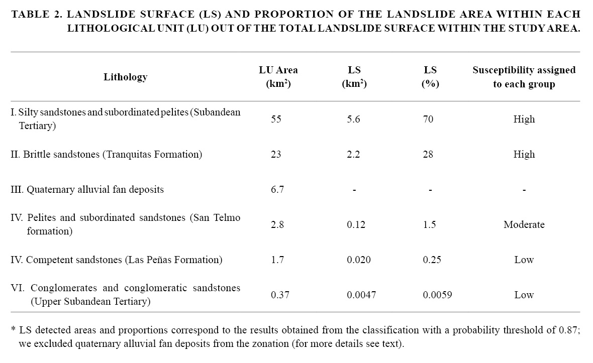 The Tartagal River basin features six lithological units that match the formations presented in Section 2 (Figs. 2, 5; Table 2). The largest unit consists of silty sandstones and subordinated pelites (55 km2); it represents about 60% of the whole basin and belongs to the Sub Andean Tertiary. This lithological group lies in the west and it covers most of the upper and about 10% of the middle basin. The classification identified 5.6 km2 affected by landslides within this group. This surface represents almost 71% of the 8.0 km2 detected by the classification. Thus, we assigned to this group a high susceptibility (Table 2).
