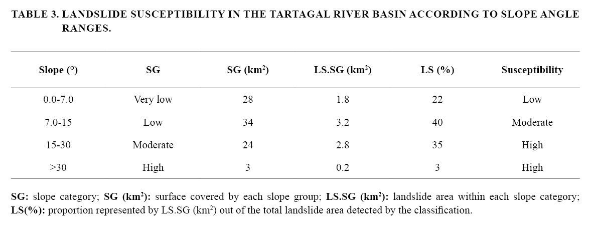 Landslides on slopes lower than 7° occupy 1.8 km2, i.e., 20% from the 8 km2 identified by the classification (Table 2). If we base the assignation of the susceptibility solely on the incidence of the events within the group, this slope category should have a moderate susceptibility. We decided, however, to assign a low susceptibility to this group because the classification overestimates the areas affected by landslides, since we were unable to discriminate among source, transport and deposition zones nor among different processes (i.e., landslides, debris flows, etc.)(see Section 3.2). Low slopes (the second group) register the highest area of landslides, i.e., they cover a surface of 3.1 km2 and represent 40% of the total. For the same reason as in the case of very low slopes, we decided to assign a moderate instead of a high susceptibility to this group (Table 3). Between 15° and 30° slopes, the surface covered by landslides was similar as in the case of low slopes. Moderate and low slopes together gathered 75% of the landslides detected. We assigned a high susceptibility to this group. Finally, landslides on high slopes occupied 0.2 km2 and a 3% of the detected areas (Table 3). We assigned a high susceptibility to this category, since it is reasonable to expect at such slopes landslides are more likely to occur. Figure 6 illustrates the slope reclassification together with the landslides pixels mapped by the maximum likelihood classifier with a threshold of 0.87.