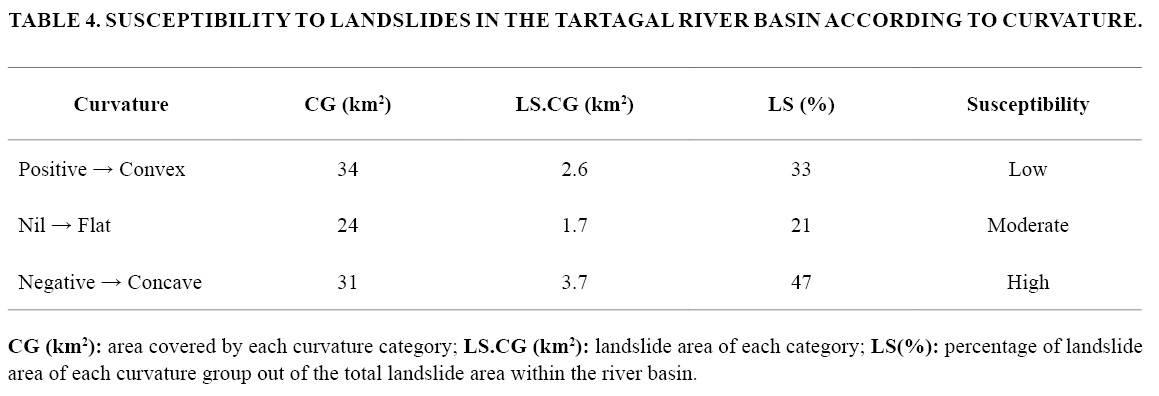 At concave locations, the classification detected more landslides, i.e., a surface that represents almost 50% of the whole area obtained from the algorithm. At flat surfaces, the number of landslide-detected pixels was somewhat lower than at convex areas. In turn, the former represents 21%, while the latter the remaining 33% of the landslide detected surfaces (Table 4). Again, we should consider that the classification lead to an overestimation of the areas covered by landslides, especially at convex locations. Thus, we have assigned low, moderate and high susceptibilities to convex, flat and concave areas, respectively. Figure 7 shows how the different curvature classes distribute spatially together with the landslides detected by the satellite image classification.