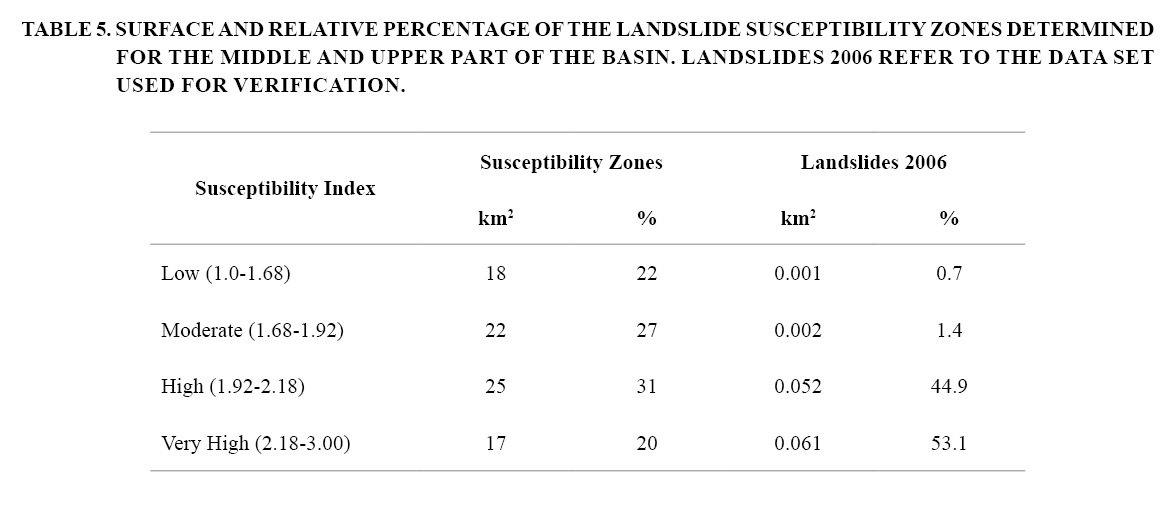 As regards the preliminary validation carried out, the 2006 landslides identified were located within the middle basin (yellow pixels in figure 1 and black pixels in figure 9). About 98% of these are located within the high or the very high susceptibility areas; 53% overlaid the zones of very high susceptibility (Table 5).