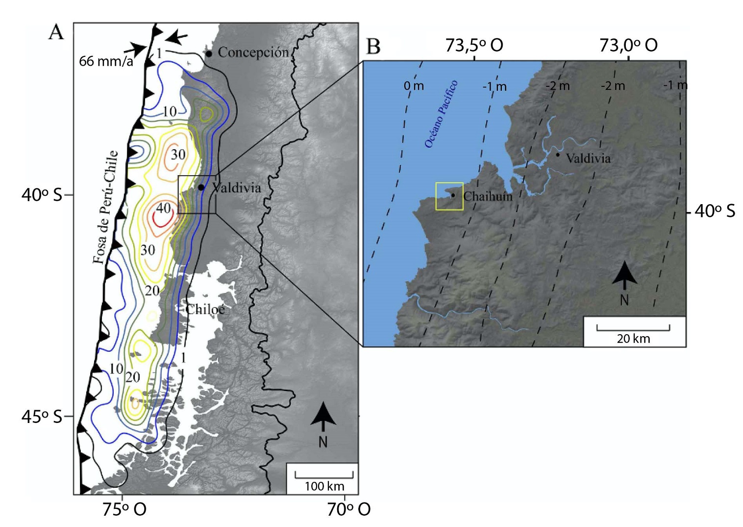 El principal potencial tsunamigénico a lo largo del margen chileno se origina en la zona interplaca que acomoda la convergencia a 66 mm/año entre las placas de Nazca y Sudamericana (Angermann et al., 1999). Dicha falla fue la fuente del terremoto del 22 de mayo de 1960 en Valdivia (Mw 9,5), que corresponde al mayor movimiento sísmico instrumentalmente medido por la sismología moderna. Dicho evento abarcó una ruptura compleja de alrededor de 1.000 km de longitud que define el segmento sísmico de Valdivia, con un desplazamiento que alcanzó hasta 44 m frente a las costas de esta ciudad (Fig. 1A; Plafker y Savage, 1970; Moreno et al., 2009). Este movimiento provocó importantes cambios geomorfológicos por la subsidencia cosísmica dentro del continente de más de 2 m (Plafker y Savage, 1970) y las grandes olas con crestas de hasta 15 m en Chile, 10 m en Hawaii y 6 m en Japón (Cisternas et al., 2005).