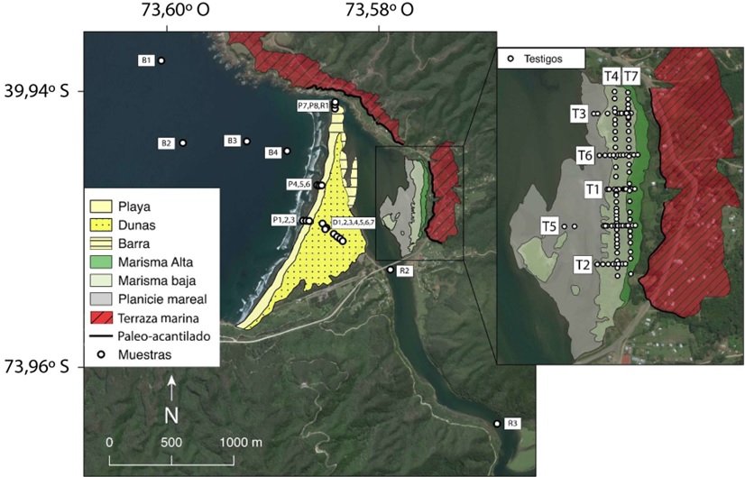 También existe registro histórico de grandes terremotos en el pasado dentro del segmento sísmico de Valdivia en los años 1575, 1737 y 1837 (e.g., Lomnitz, 2004; Cisternas et al., 2005). La evidencia de los abruptos y recurrentes cambios cosísmicos en la altura de la costa junto con las inundaciones debido a tsunamis asociados a estos eventos, queda preservada en los estratos enterrados dentro de las marismas. Estas corresponden a ambientes vegetados (flora halófila), de aparición tardía dentro del Holoceno, que se desarrollan dentro de la zona intermareal (Frey y Basan, 1985; Atwater et al., 1992). La investigación que se ha llevado a cabo dentro de dichos ambientes en las costas del centro sur de Chile (Cisternas et al., 2005; Nelson et al., 2009; Garrett et al., 2013, 2015; Ely et al., 2014; Dura et al., 2015; Nentwig et al., 2018), en conjunto con el estudio de evidencias asociadas a otros ambientes y procesos tales como diamictitas en Chiloé (Cisternas et al., 2017) y turbiditas lacustres (Moernaut et al., 2007, 2014, 2018) han permitido respaldar, e incluso ampliar, el registro histórico mencionado.